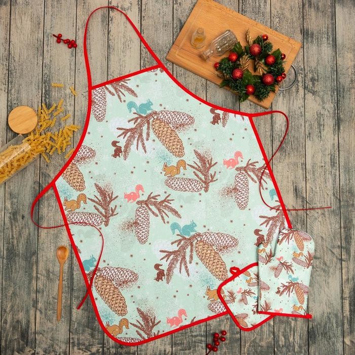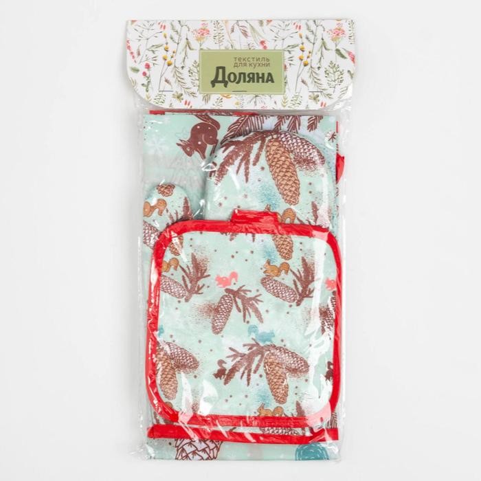 Кухонный новогодний набор Доляна«Шишки»,прихватка 17*17см,варежка 26*16см, фартук 60*80 см 100% п/э