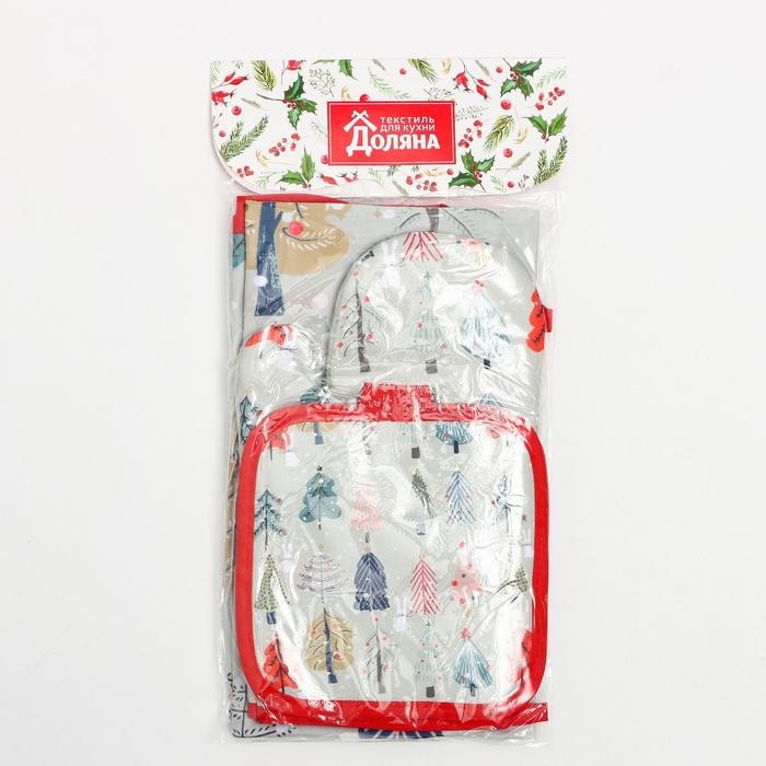Кухонный новогодний набор Доляна«Новогодний лес» фартук 70х80см, прихватка 17х17см, варежка-прихватка 26х16см