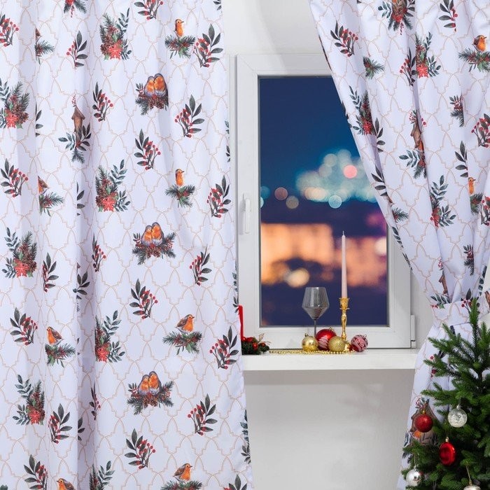 Новогодний комплект штор для кухни с подхватами «Beautiful birds» 145х180см-2 шт., габардин