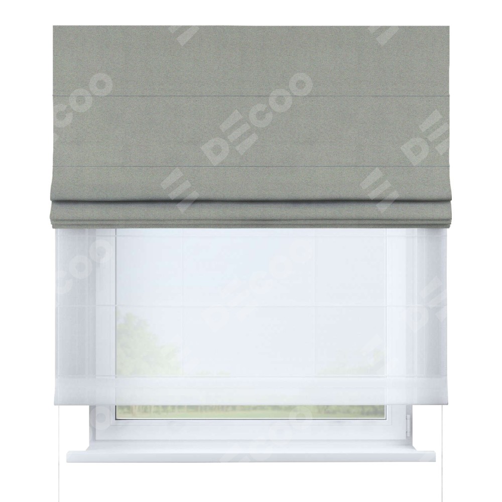 Римская штора день-ночь производителя «Cortin», используется для проёма, пошита из двух полотен, с лицевой стороны блэкаут однотонный серый артикул 88292, вторая ткань тюль (по стандарту комплектуется тюль белого цвета артикул V-01). Имеет универсальный механизм и подходит для монтажа: на потолок, на стену и в нишу.