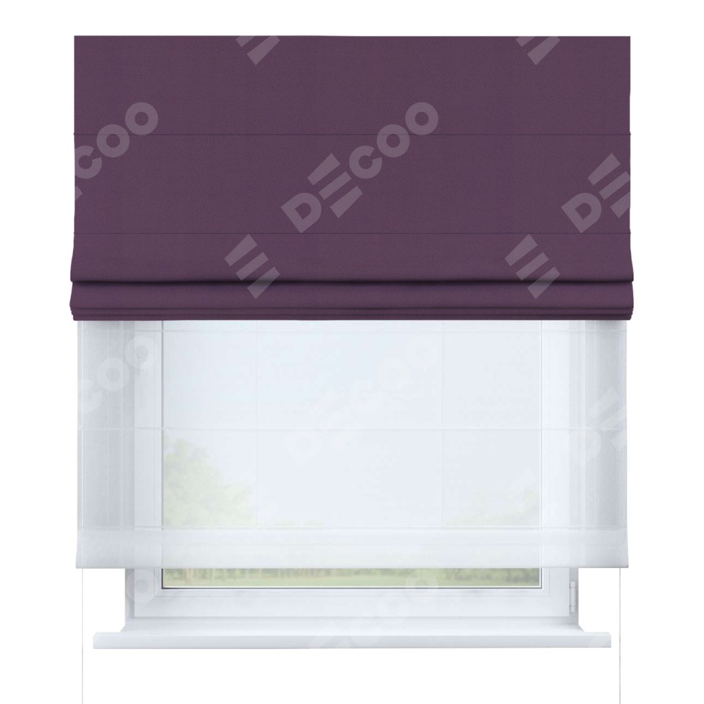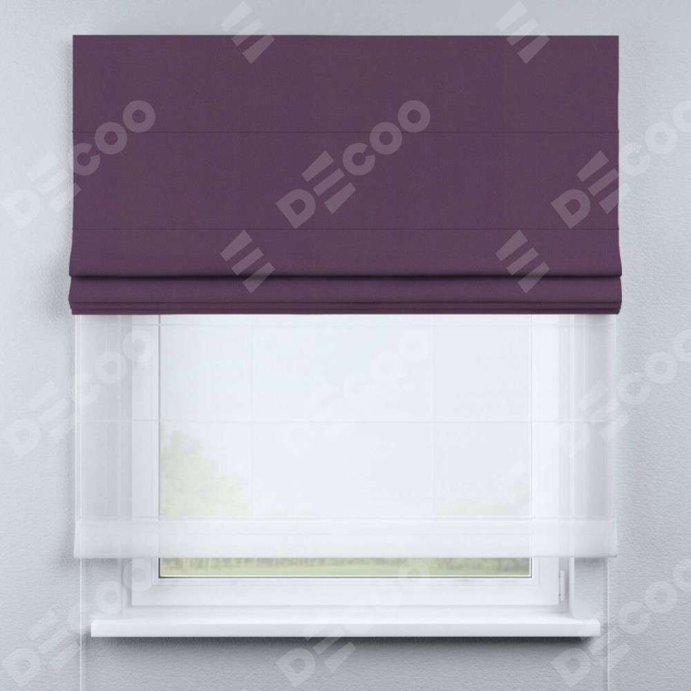 Римская штора день-ночь производителя «Cortin», используется для проёма, пошита из двух полотен, с лицевой стороны блэкаут однотонный фуксия артикул 88303, вторая ткань тюль (по стандарту комплектуется тюль белого цвета артикул V-01). Имеет универсальный механизм и подходит для монтажа: на потолок, на стену и в нишу.