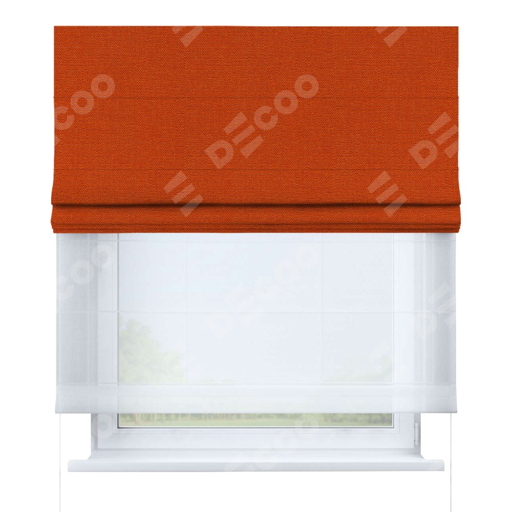 Римская штора день-ночь производителя «Cortin», используется для проёма, пошита из двух полотен, с лицевой стороны лён терракотовый артикул 53440, вторая ткань тюль (по стандарту комплектуется тюль белого цвета артикул V-01). Имеет универсальный механизм и подходит для монтажа: на потолок, на стену и в нишу.