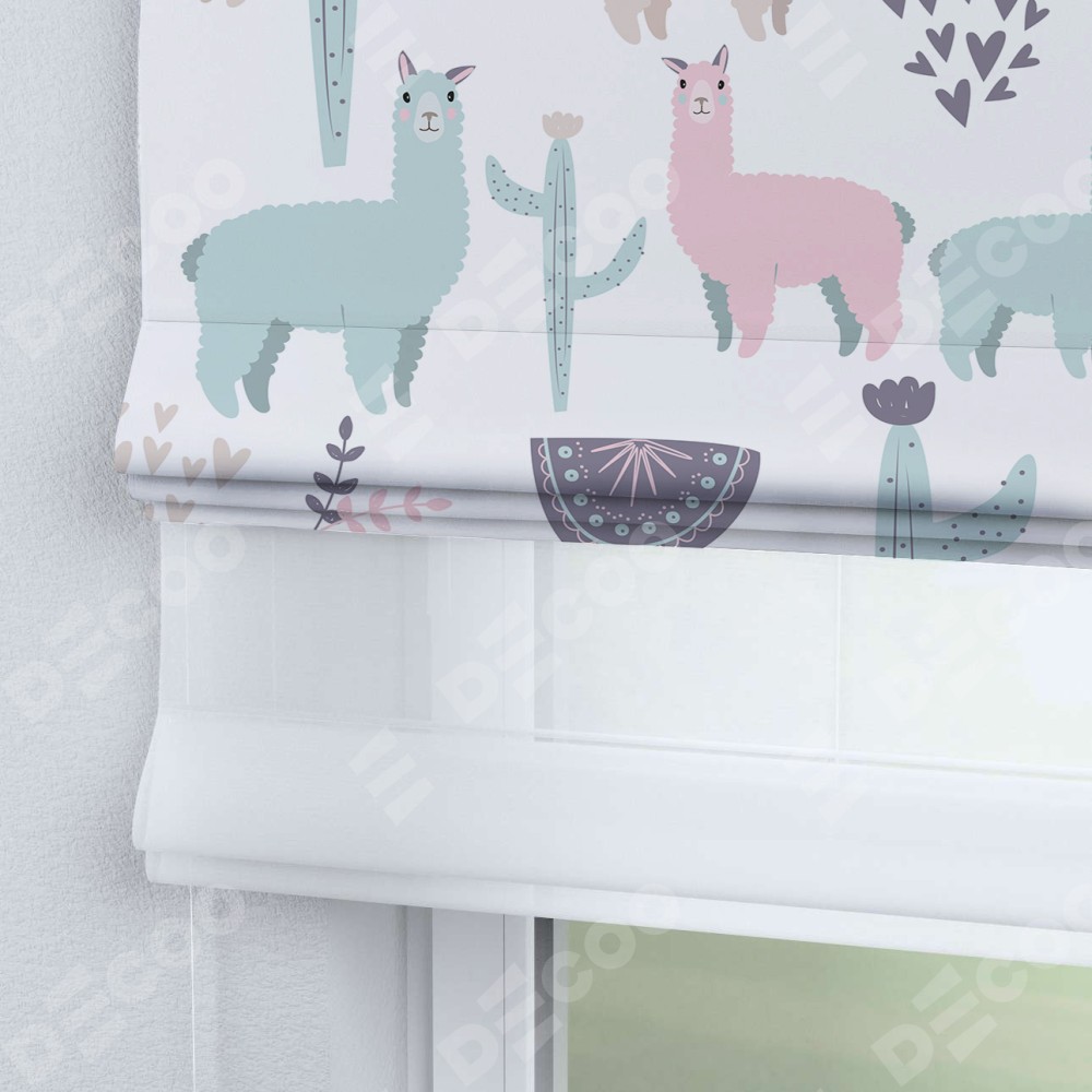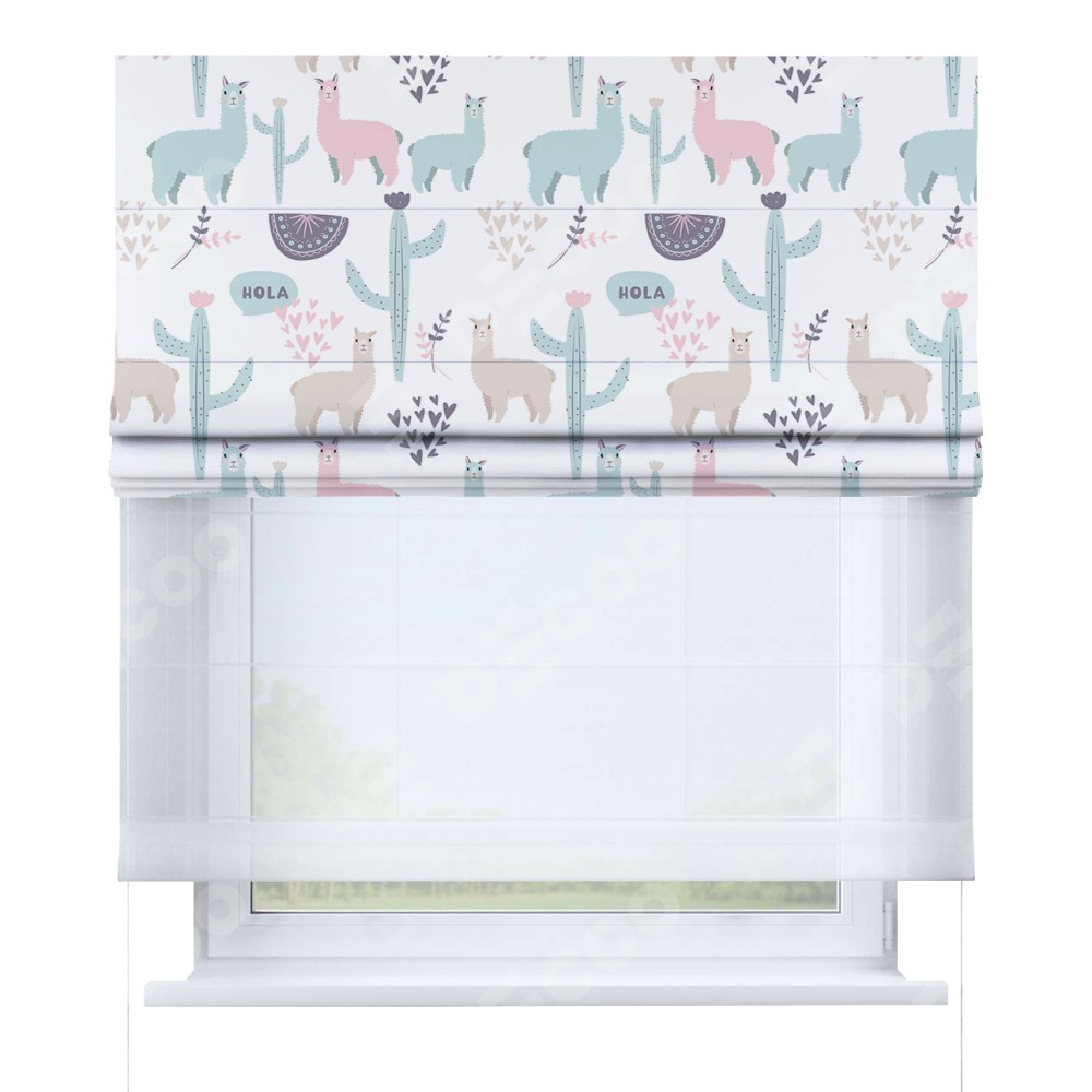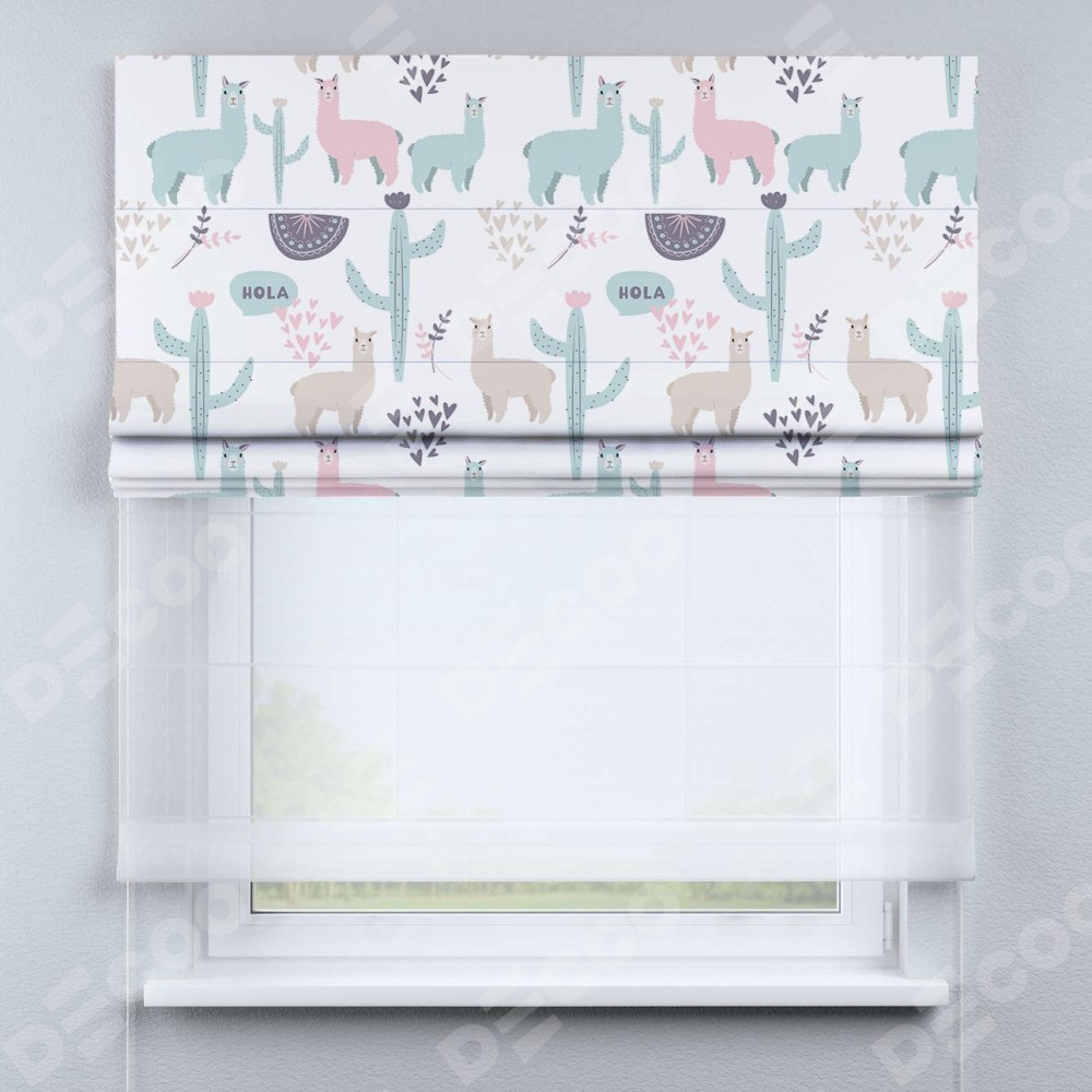 Римская штора день-ночь производителя «Cortin», используется для проёма, пошита из двух полотен, с лицевой блэкаут с нанесением сублимационной печати «Милый лама», вторая ткань тюль (по стандарту комплектуется тюль белого цвета артикул V-01). Имеет универсальный механизм и подходит для монтажа: на потолок, на стену и в нишу.