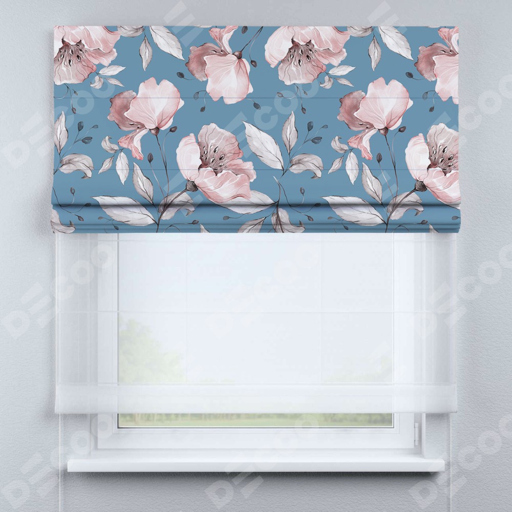 Римская штора день-ночь производителя «Cortin», используется для проёма, пошита из двух полотен, с лицевой блэкаут с нанесением сублимационной печати «Розовая лагуна», вторая ткань тюль (по стандарту комплектуется тюль белого цвета артикул V-01). Имеет универсальный механизм и подходит для монтажа: на потолок, на стену и в нишу.