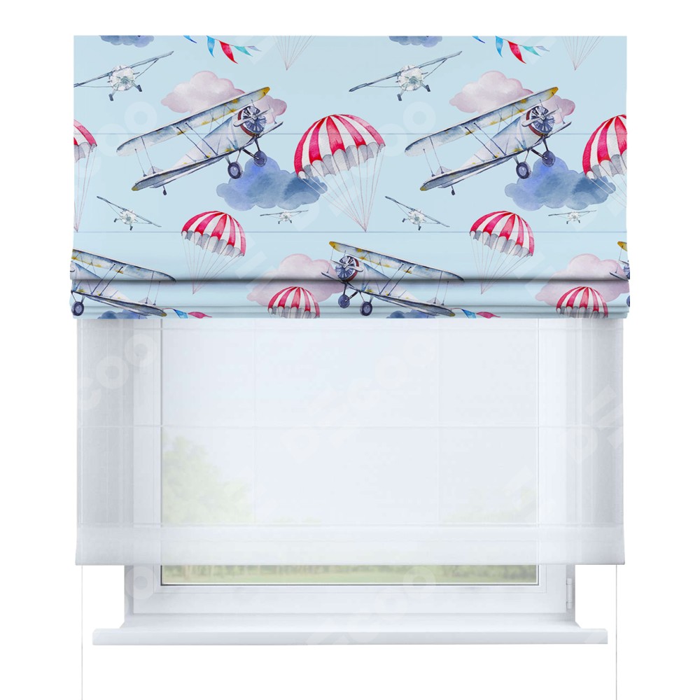 Римская штора день-ночь производителя «Cortin», используется для проёма, пошита из двух полотен, с лицевой блэкаут с нанесением сублимационной печати «Самолёт», вторая ткань тюль (по стандарту комплектуется тюль белого цвета артикул V-01). Имеет универсальный механизм и подходит для монтажа: на потолок, на стену и в нишу.
