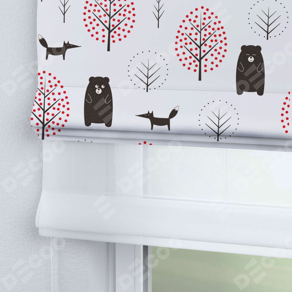 Римская штора день-ночь производителя «Cortin», используется для проёма, пошита из двух полотен, с лицевой блэкаут с нанесением сублимационной печати «Сканди лес», вторая ткань тюль (по стандарту комплектуется тюль белого цвета артикул V-01). Имеет универсальный механизм и подходит для монтажа: на потолок, на стену и в нишу.