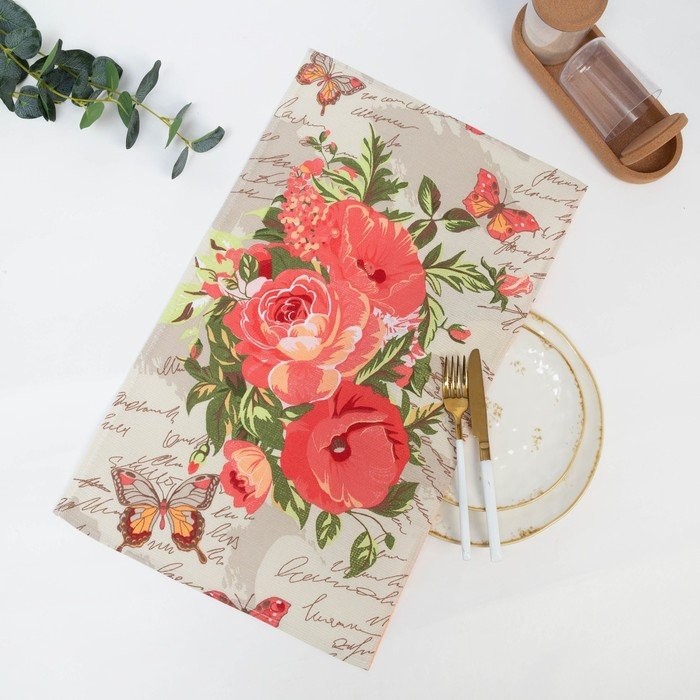 Полотенце 35×60 см, Букет розы-маки, песочный, вафля, 160 гр/м2, хлопок 100%