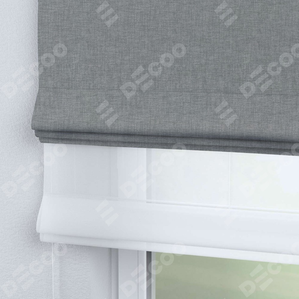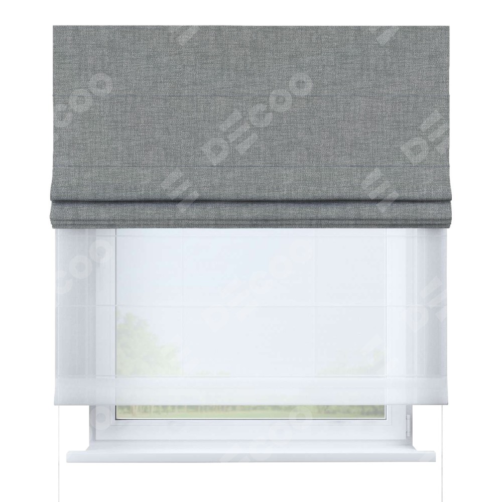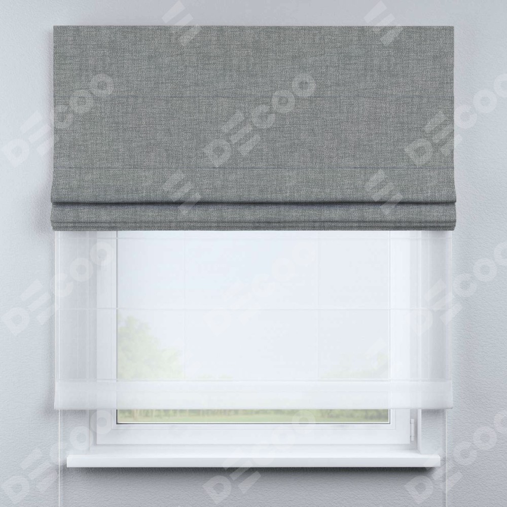 Римская штора день-ночь производителя «Cortin», используется для проёма, пошита из двух полотен, с лицевой стороны рогожка димаут тёмно-серый артикул 80418, вторая ткань тюль (по стандарту комплектуется тюль белого цвета артикул V-01). Имеет универсальный механизм и подходит для монтажа: на потолок, на стену и в нишу.