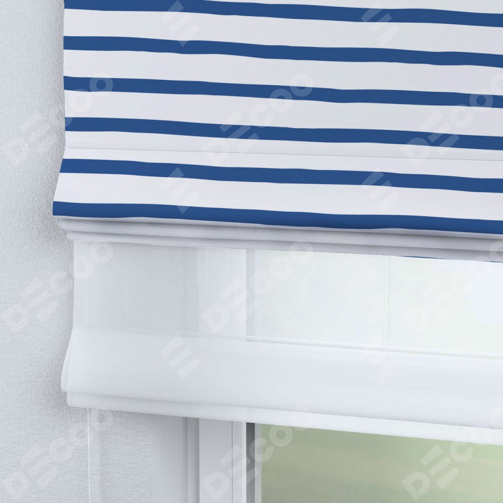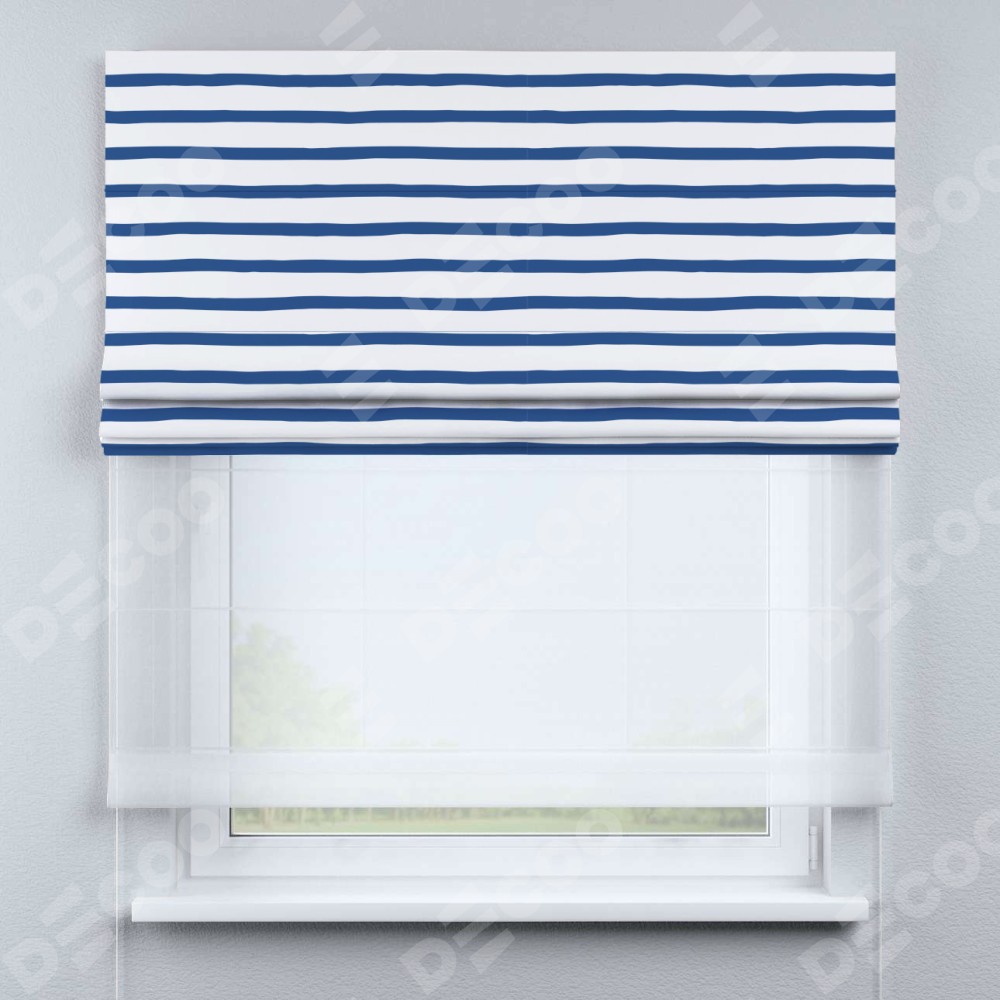 Римская штора день-ночь производителя «Cortin», используется для проёма, пошита из двух полотен, с лицевой блэкаут с нанесением сублимационной печати «Морская полоска», вторая ткань тюль (по стандарту комплектуется тюль белого цвета артикул V-01). Имеет универсальный механизм и подходит для монтажа: на потолок, на стену и в нишу.
