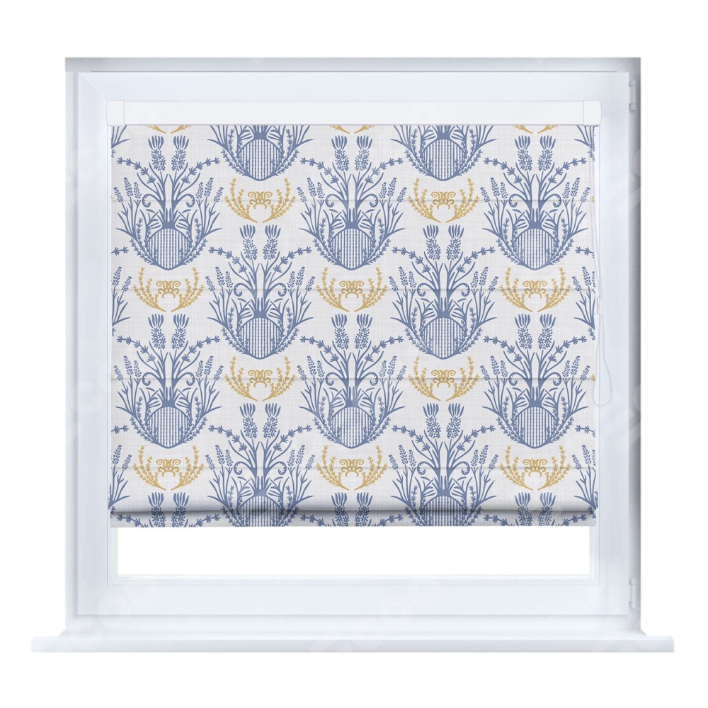 Римская штора кассетного типа, производителя «Cortin», устанавливается только на пластиковые окна и прилегает к стеклопакету, пошита из ткани блэкаут с нанесением сублимационной печати «Шикарная лаванда».