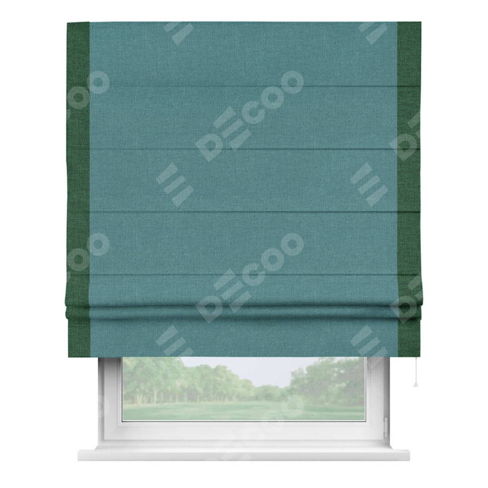 Римская штора производителя «Cortin», используется для проёма, пошита из ткани лён бирюзовый, артикул 53436. Отделка шторы кантом «Стрим Дуо», ткань для канта используется из льна разной расцветки на выбор. Имеет универсальный механизм и подходит для монтажа: на потолок, на стену и в нишу.