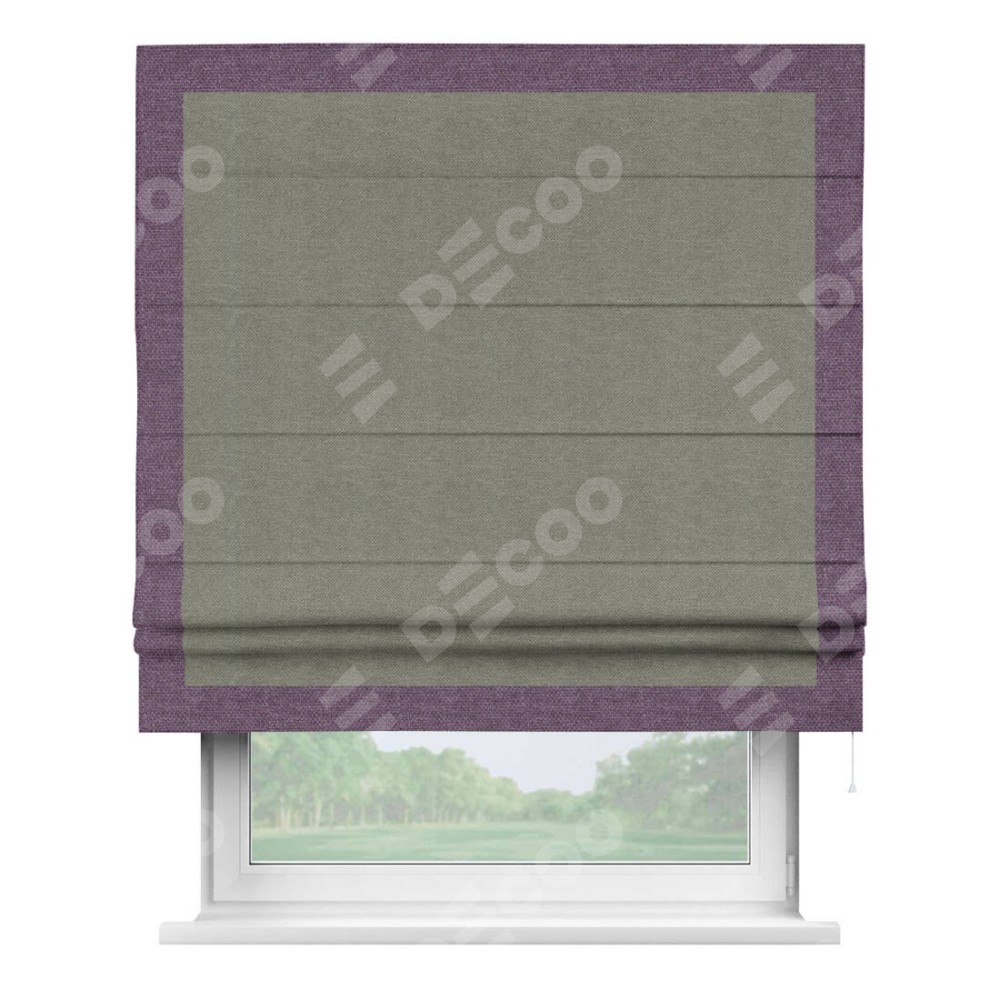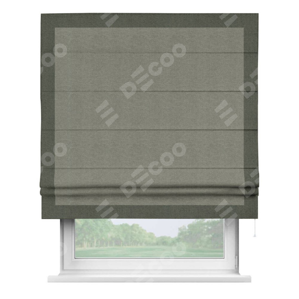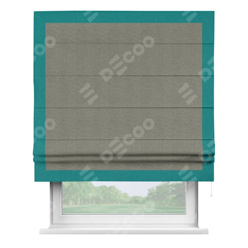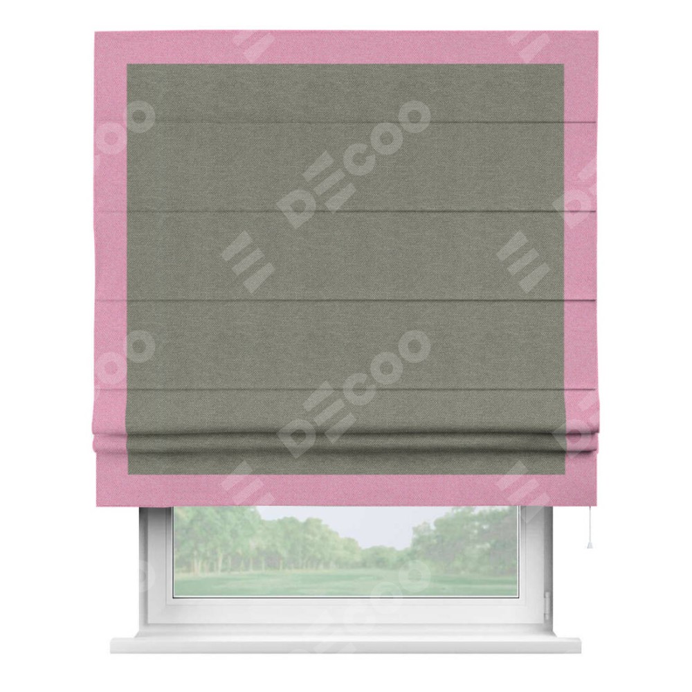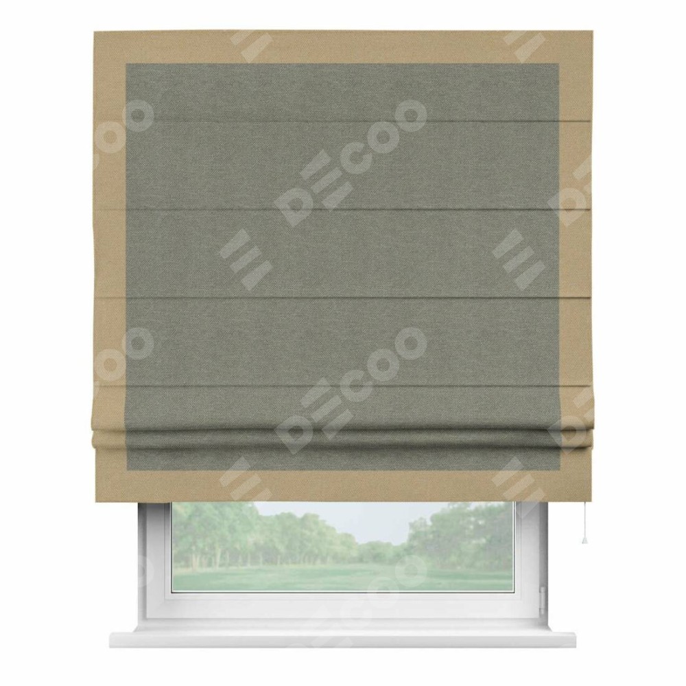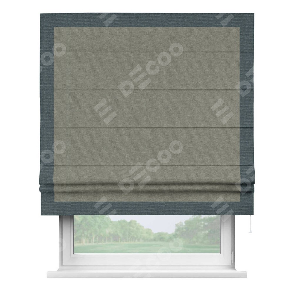 Римская штора производителя «Cortin», используется для проёма, пошита из ткани лён димаут стальной, артикул 25. Отделка шторы кантом «Чесс», ткань для канта используется из льна димаут разной расцветки на выбор. Имеет универсальный механизм и подходит для монтажа: на потолок, на стену и в нишу.
