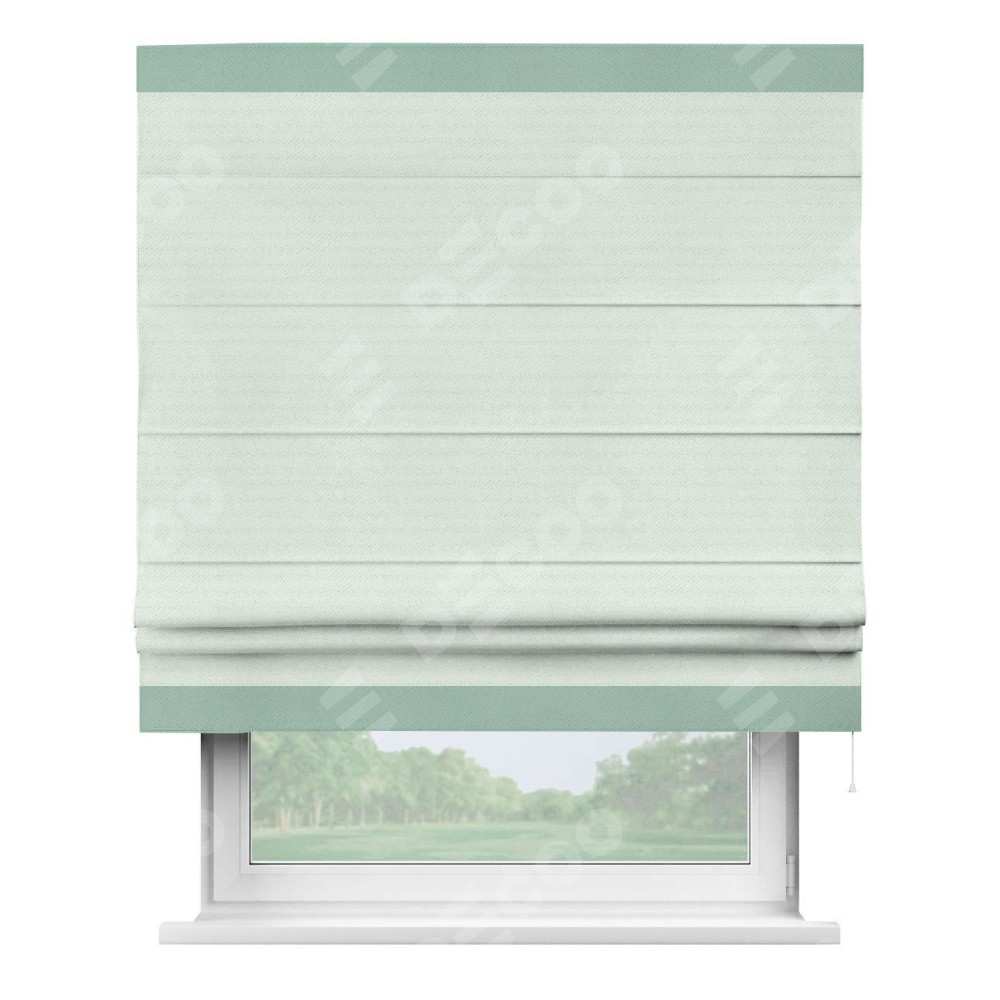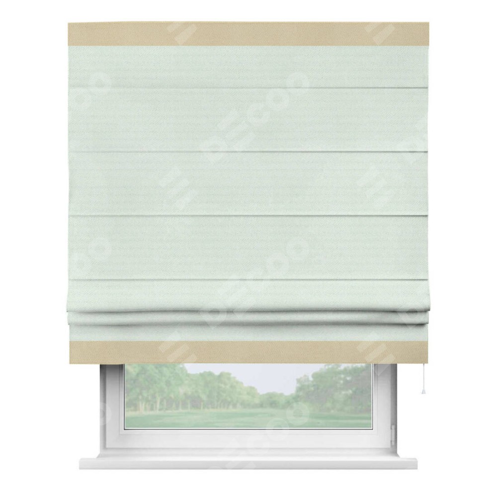 Римская штора производителя «Cortin», используется для проёма, пошита из ткани блэкаут однотонный дымчато-молочный, артикул ткани 88282. Отделка шторы кантом «Горизонт», ткань для канта используется из блэкаута однотонного разной расцветки на выбор. Имеет универсальный механизм и подходит для монтажа: на потолок, на стену и в нишу.