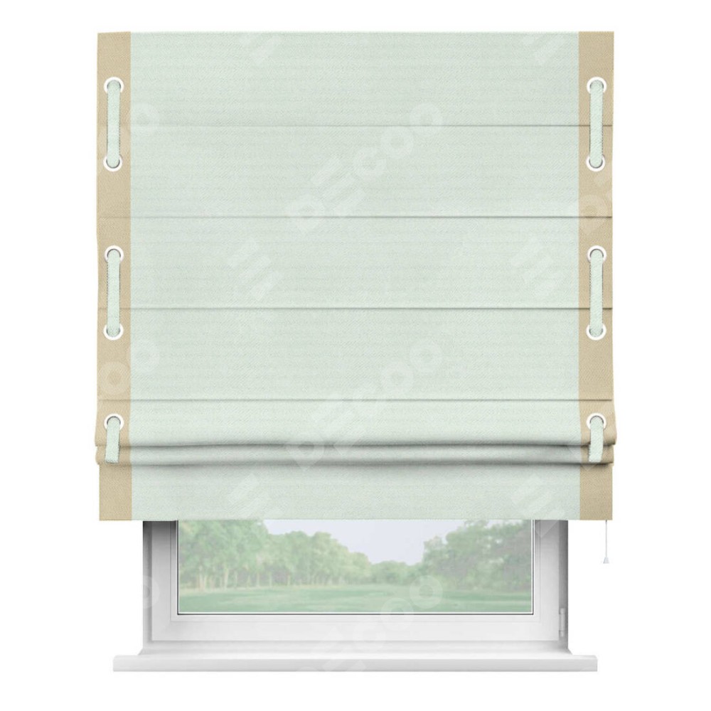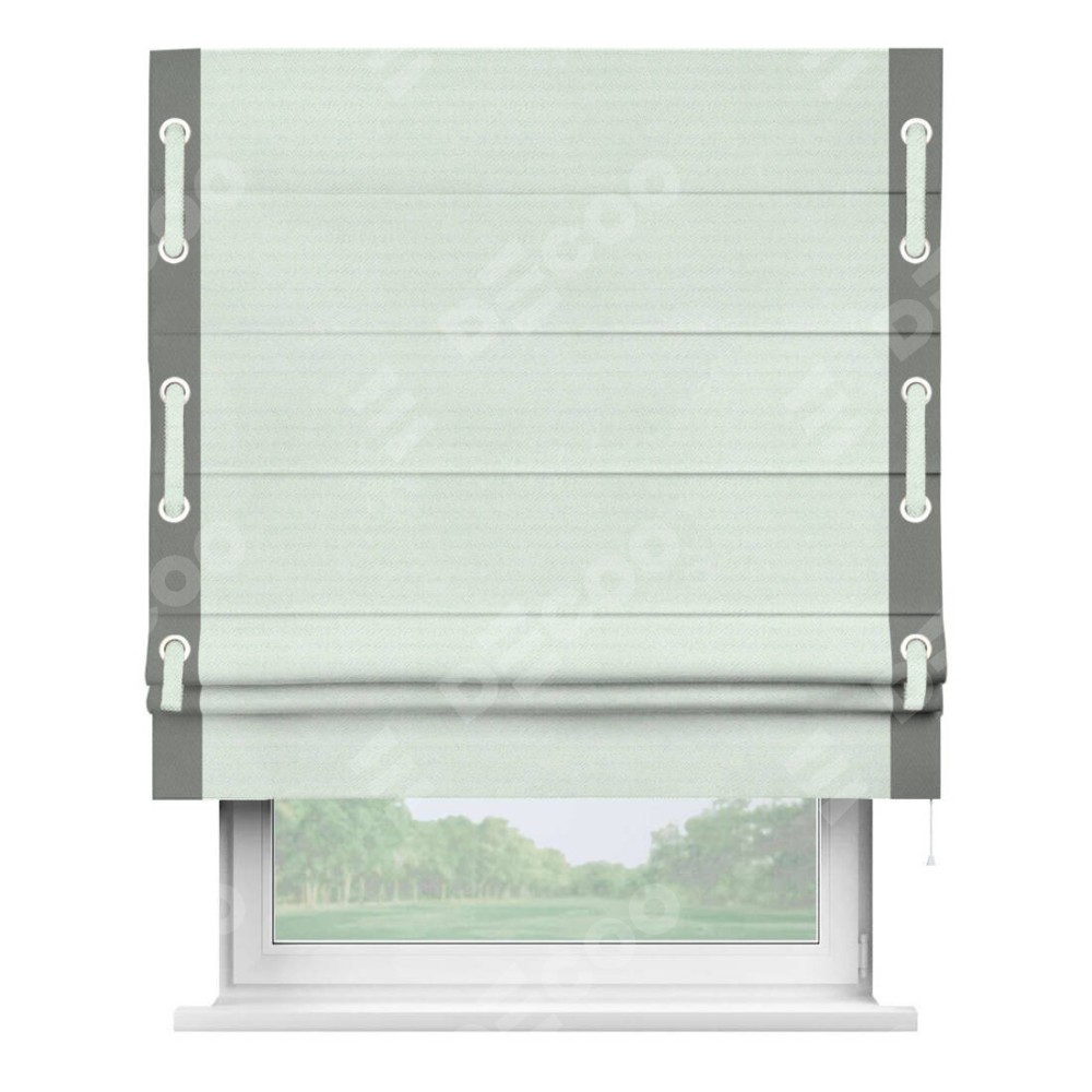 Римская штора производителя «Cortin», используется для проёма, пошита из ткани блэкаут однотонный дымчато-молочный, артикул ткани 88282. Отделка шторы кантом «Стрим Дуо» на кантах расположены люверсы с пояском, ткань для канта используется из блэкаута однотонного разной расцветки на выбор. Ткань для пояска обычно используется из основной ткани шторы, а так же можно сделать из любой расцветки по желанию. Имеет универсальный механизм и подходит для монтажа: на потолок, на стену и в нишу.