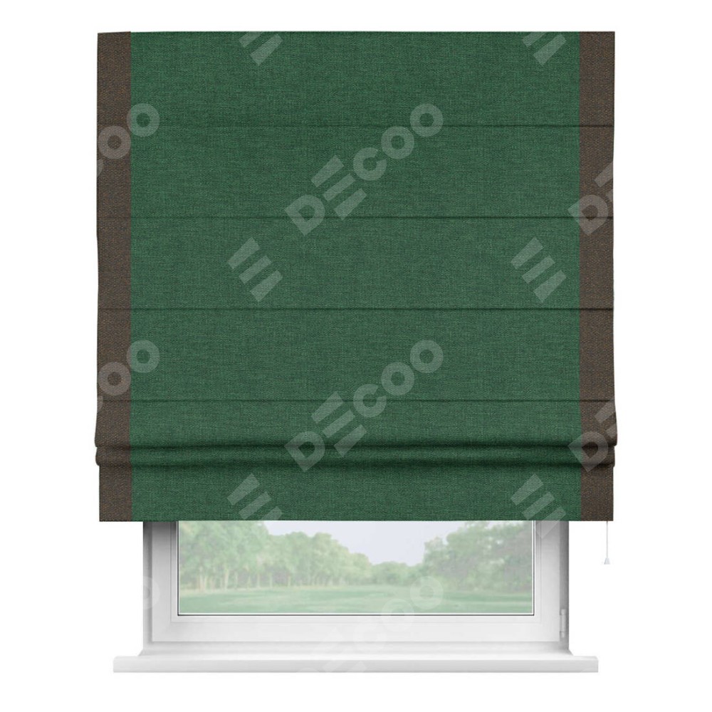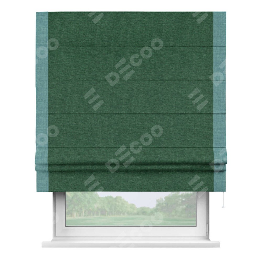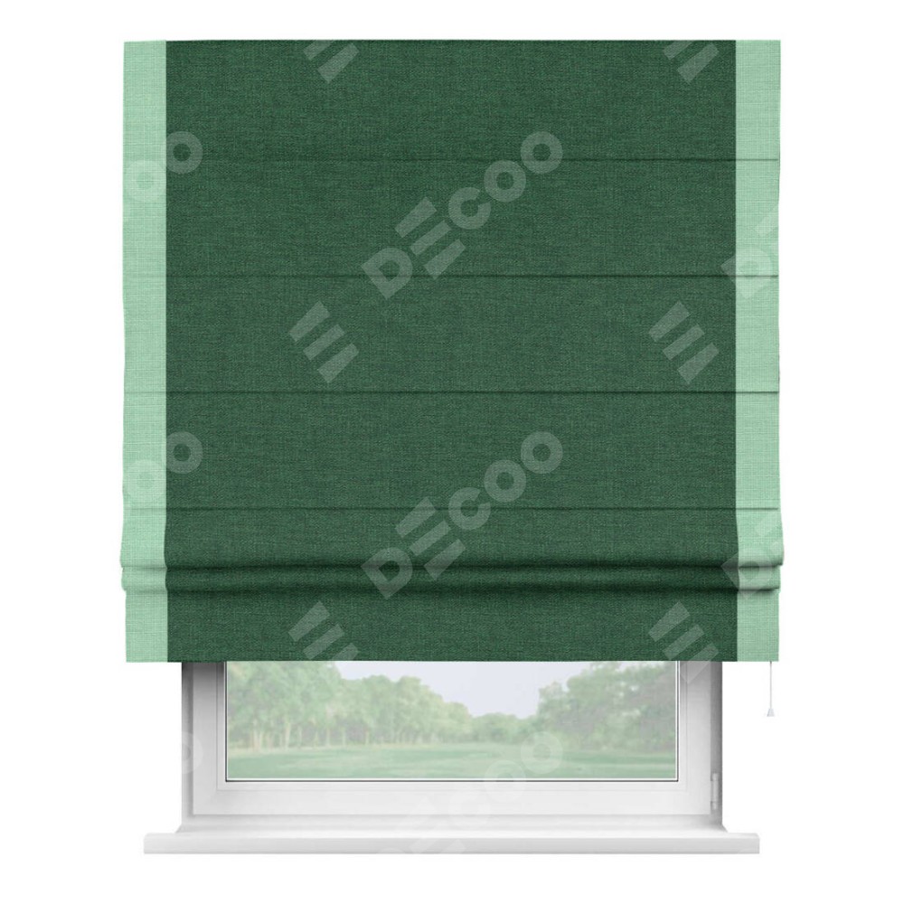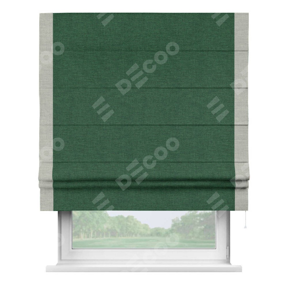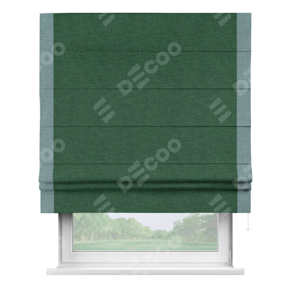 Римская штора производителя «Cortin», используется для проёма, пошита из ткани лён серо-зеленый, артикул 63740. Отделка шторы кантом «Стрим Дуо», ткань для канта используется из льна разной расцветки на выбор. Имеет универсальный механизм и подходит для монтажа: на потолок, на стену и в нишу.