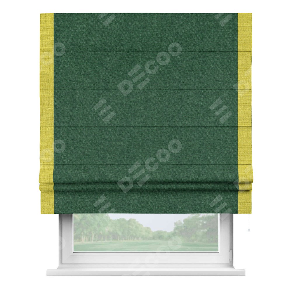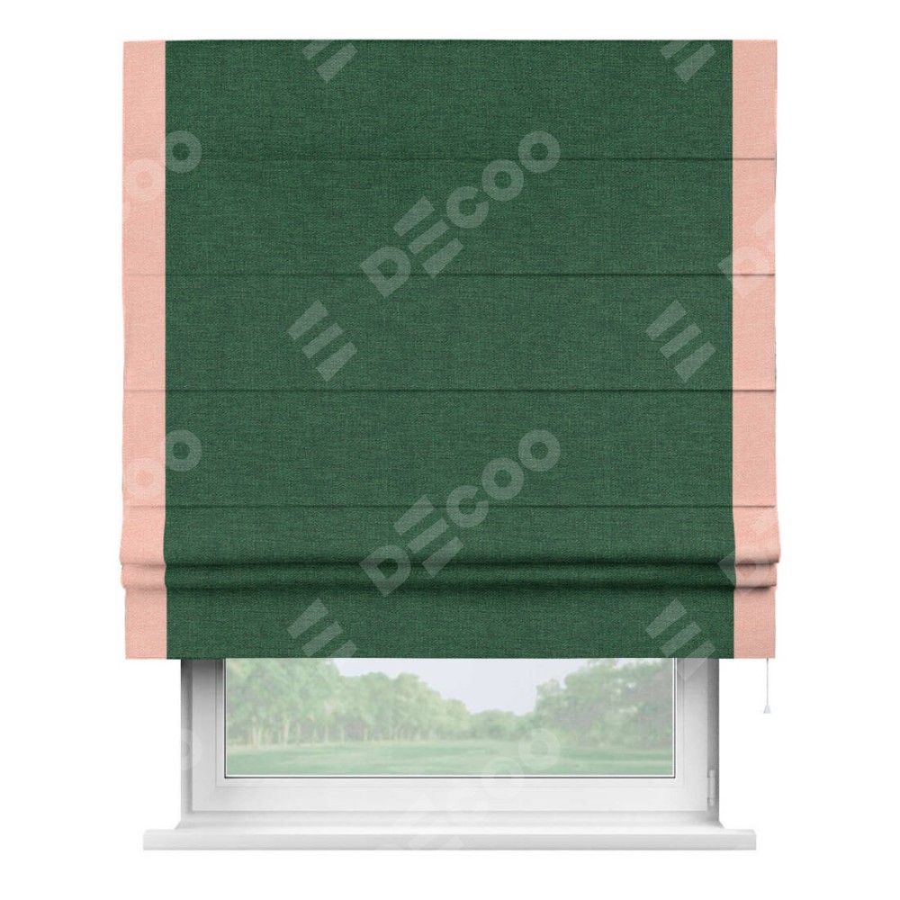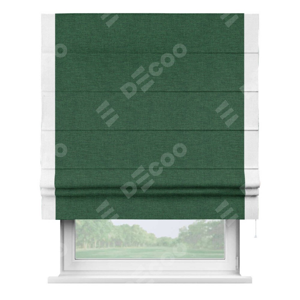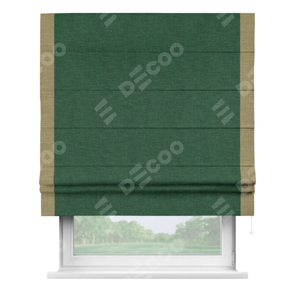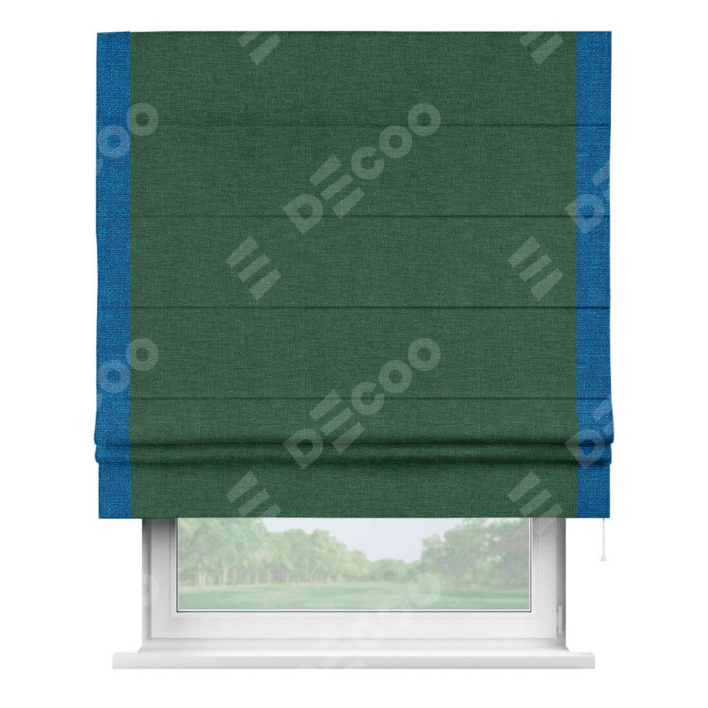 Римская штора производителя «Cortin», используется для проёма, пошита из ткани лён серо-зеленый, артикул 63740. Отделка шторы кантом «Стрим Дуо», ткань для канта используется из льна разной расцветки на выбор. Имеет универсальный механизм и подходит для монтажа: на потолок, на стену и в нишу.
