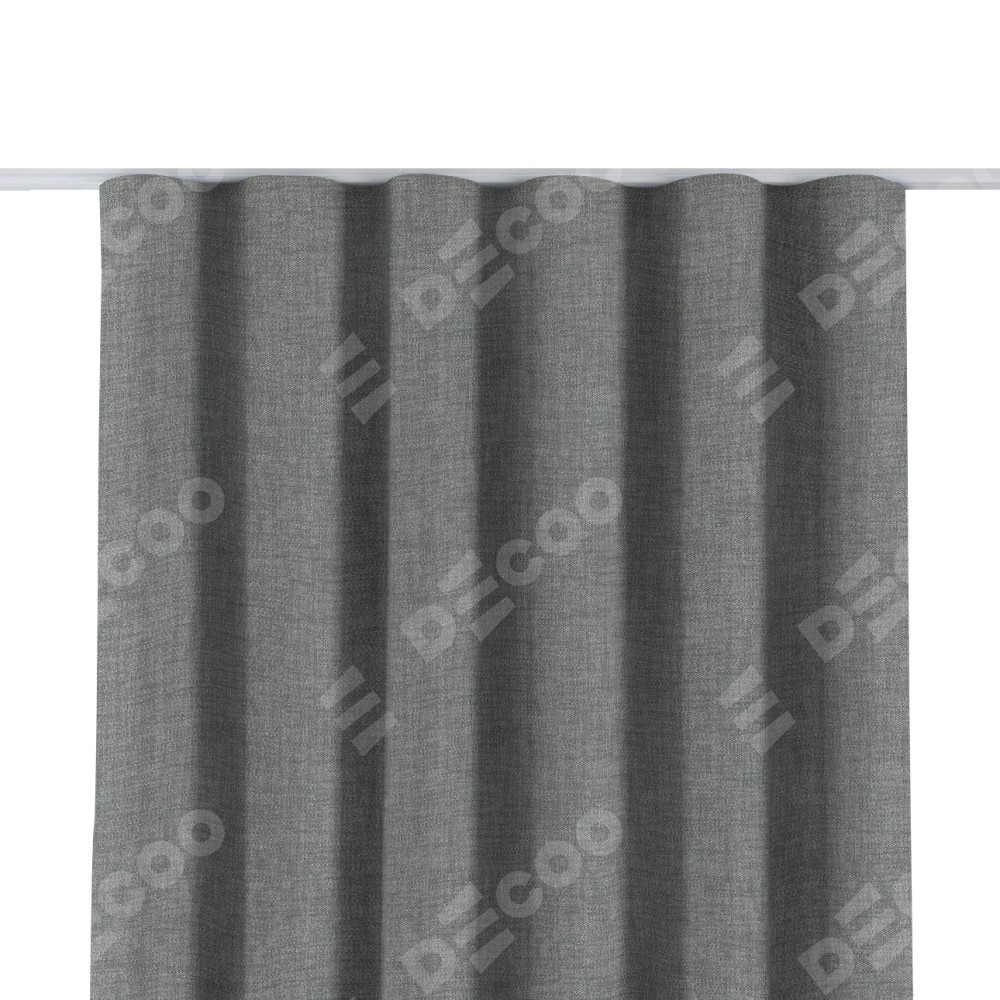 Комплект прямых штор, от производителя «Cortin», пошиты из ткани рогожка димаут тёмно-серый, артикул ткани 80418. С изнаночной стороны в верхней части штор пристрачивается шторная лента с декоративными складками «Волна». Для создания элегантных складок прямые шторы шьются по стандарту с коэффициентом 1:2 (на 100 см. ширины проёма 200 см. ширины ткани).