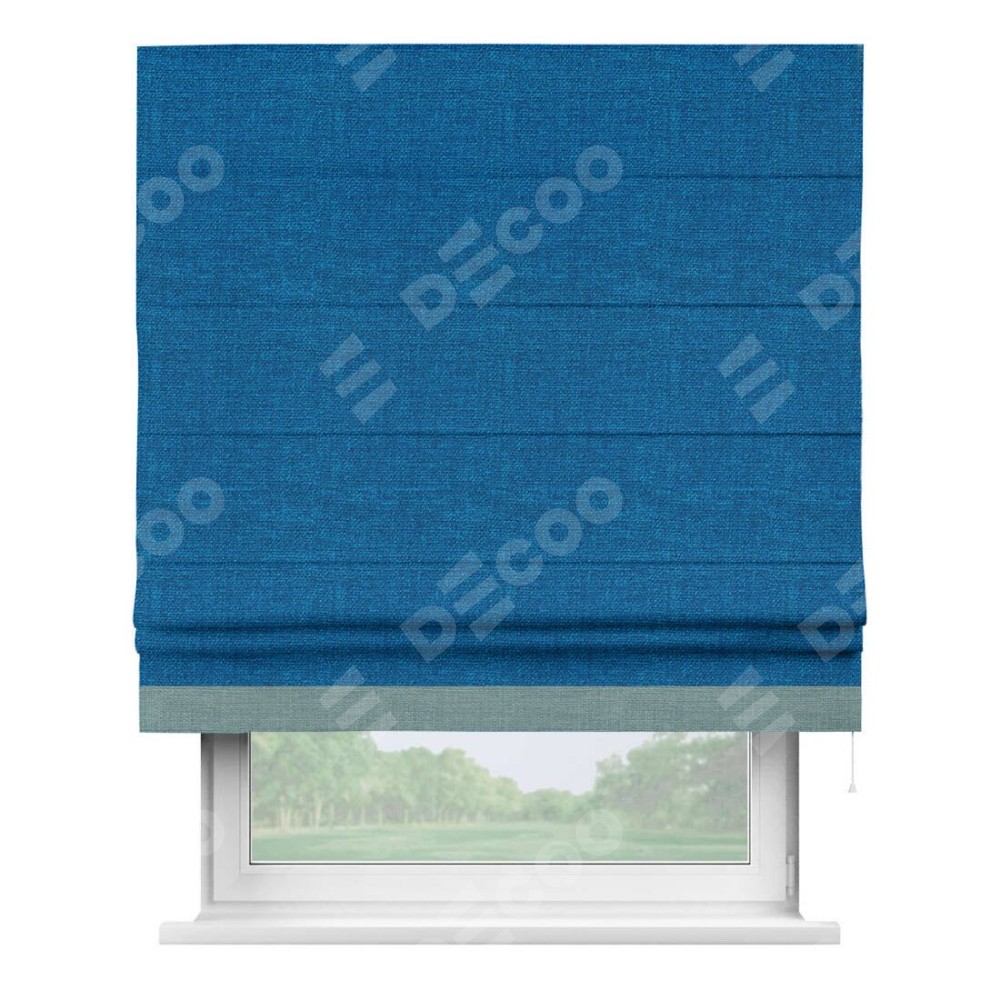Римская штора производителя «Cortin», используется для проёма, пошита из ткани лён синий, артикул 63742. Отделка шторы кантом «Джестер», ткань для канта используется из льна разной расцветки на выбор. Имеет универсальный механизм и подходит для монтажа: на потолок, на стену и в нишу.