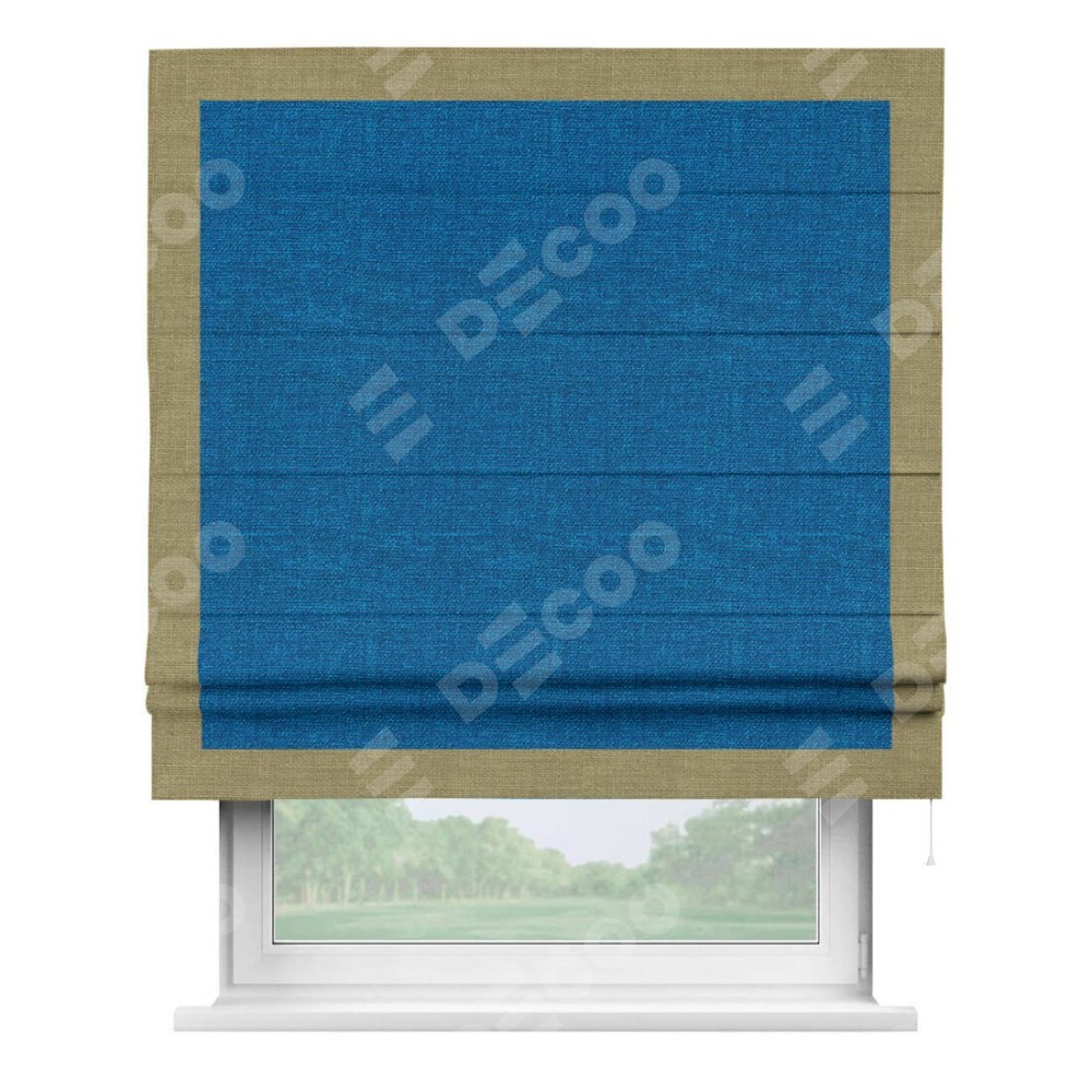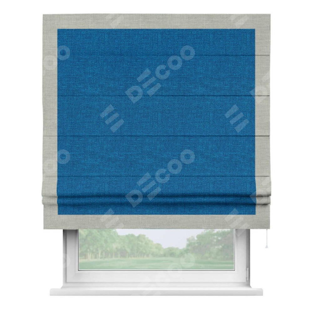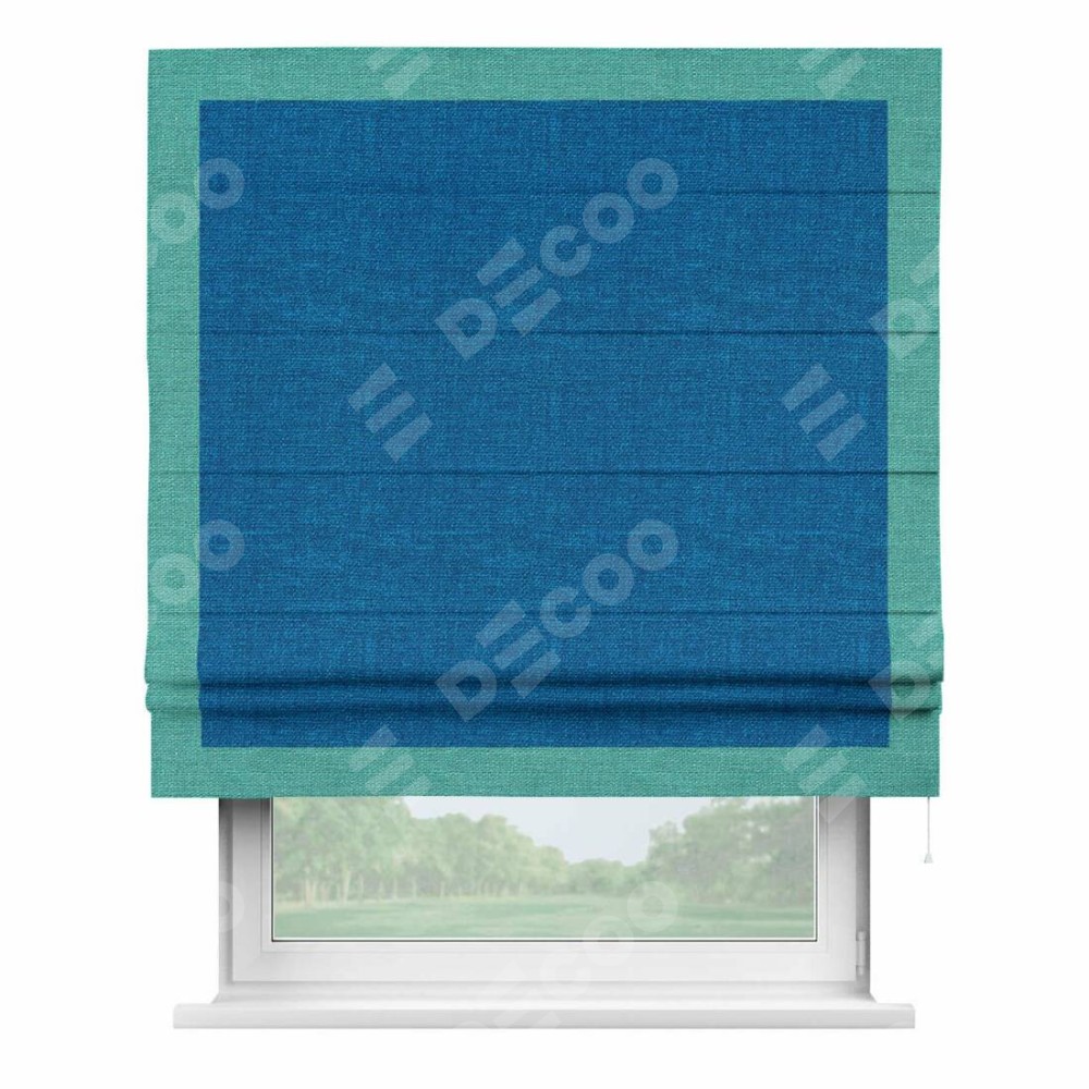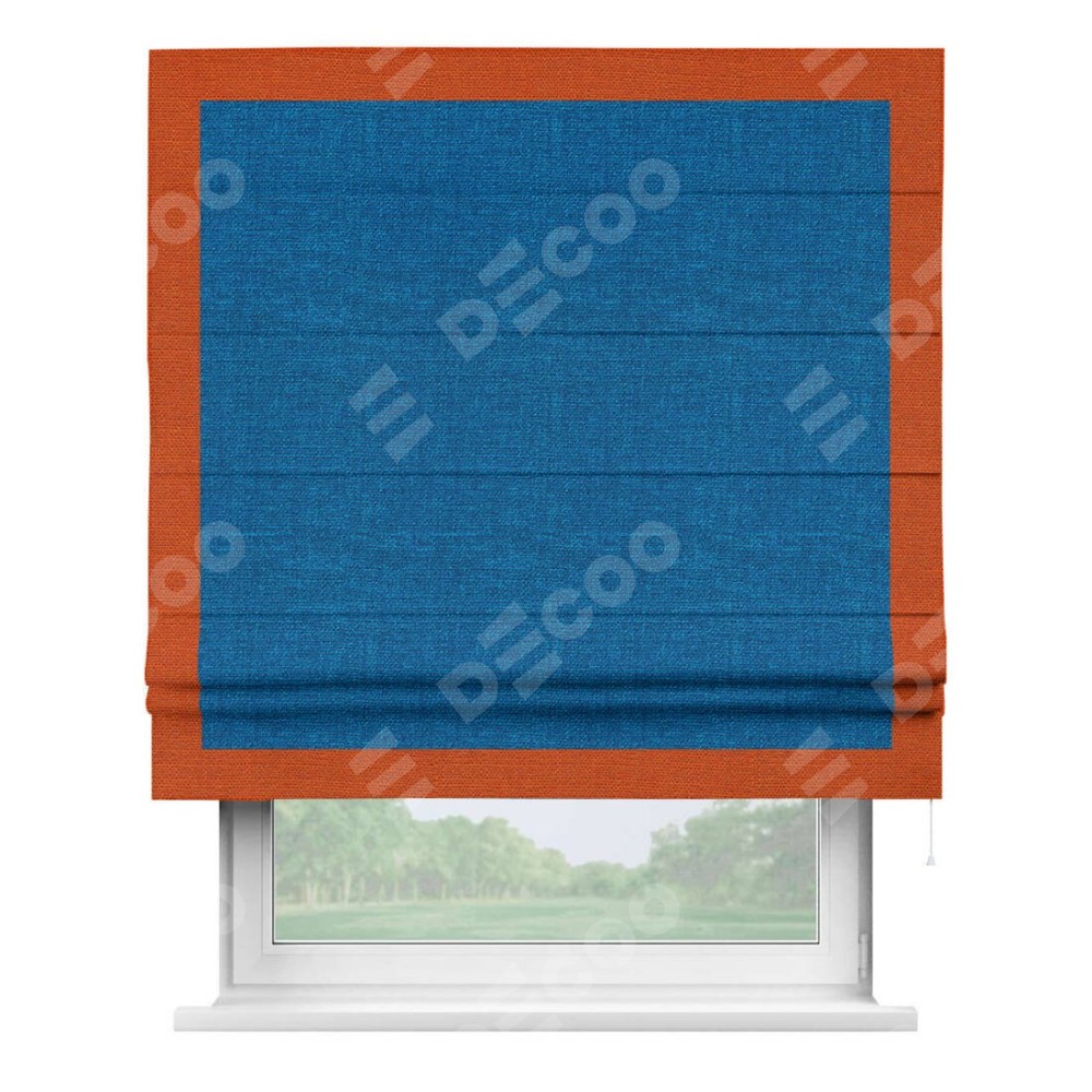 Римская штора производителя «Cortin», используется для проёма, пошита из ткани лён синий, артикул 63742. Отделка шторы кантом «Чесс», ткань для канта используется из льна разной расцветки на выбор. Имеет универсальный механизм и подходит для монтажа: на потолок, на стену и в нишу.