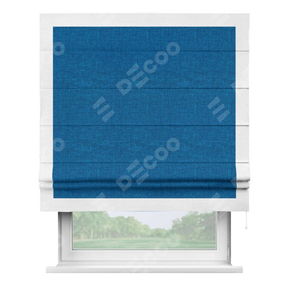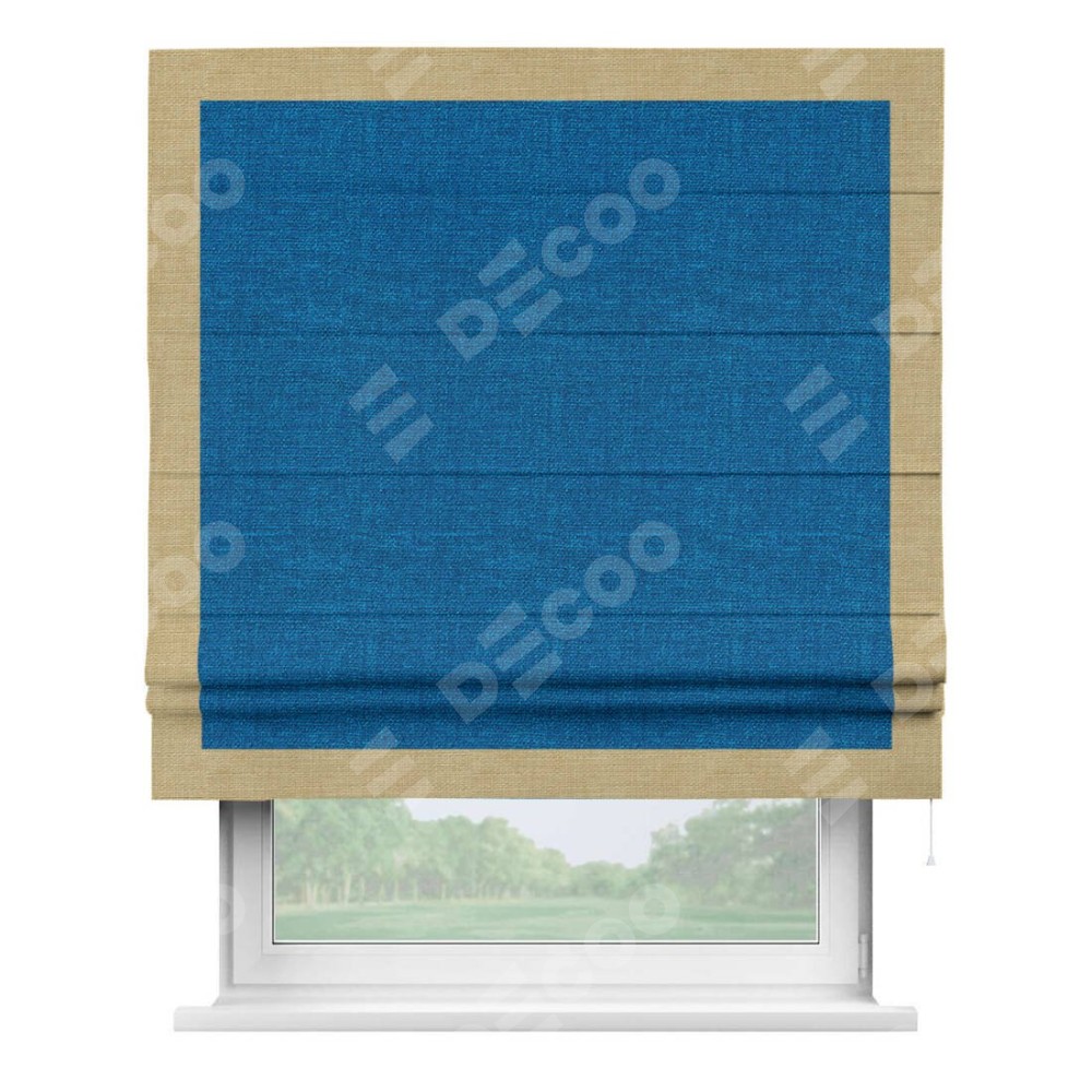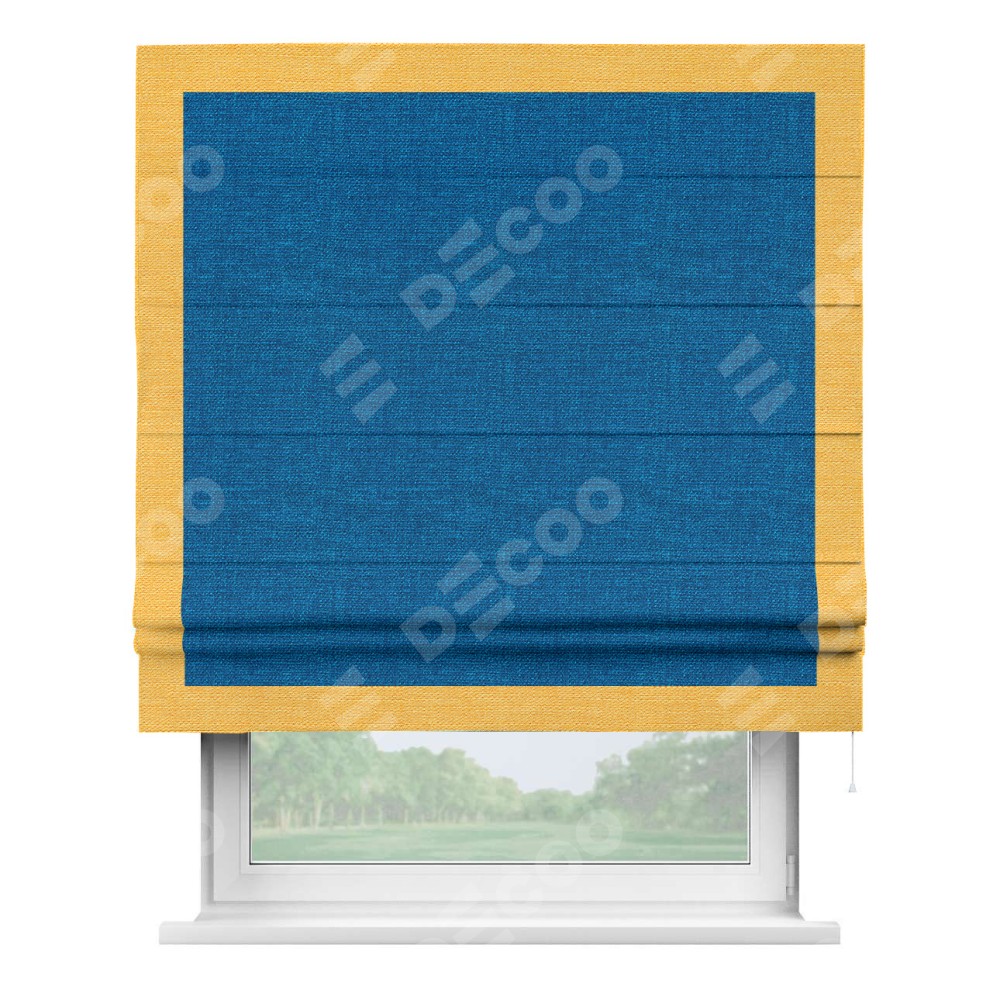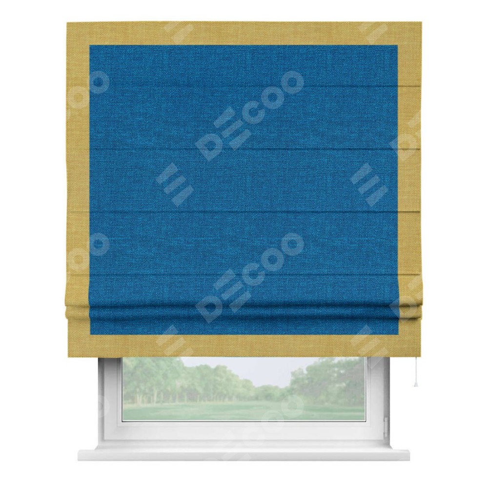 Римская штора производителя «Cortin», используется для проёма, пошита из ткани лён синий, артикул 63742. Отделка шторы кантом «Чесс», ткань для канта используется из льна разной расцветки на выбор. Имеет универсальный механизм и подходит для монтажа: на потолок, на стену и в нишу.