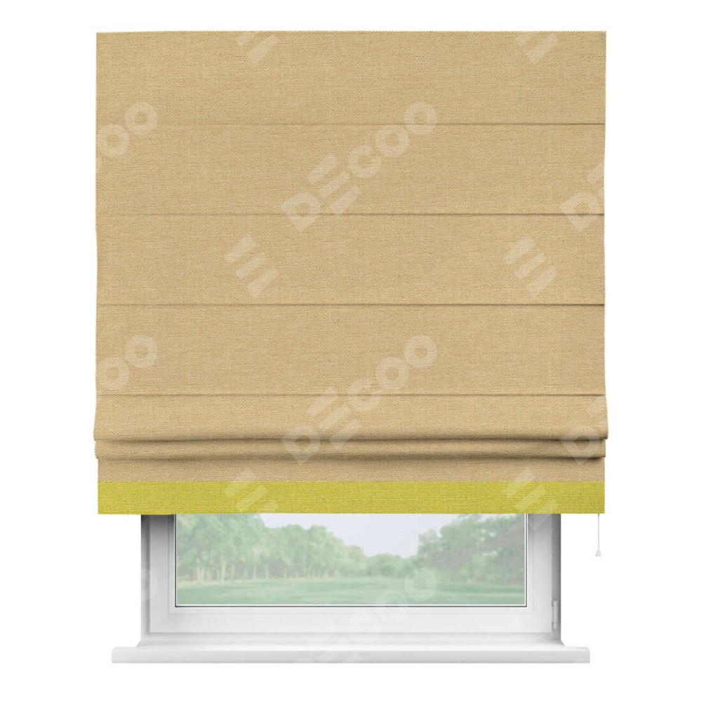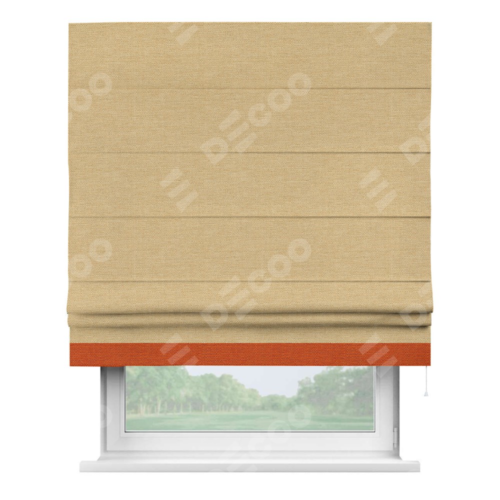 Римская штора производителя «Cortin», используется для проёма, пошита из ткани лён темно-бежевый, артикул 53433. Отделка шторы кантом «Джестер», ткань для канта используется из льна разной расцветки на выбор. Имеет универсальный механизм и подходит для монтажа: на потолок, на стену и в нишу.