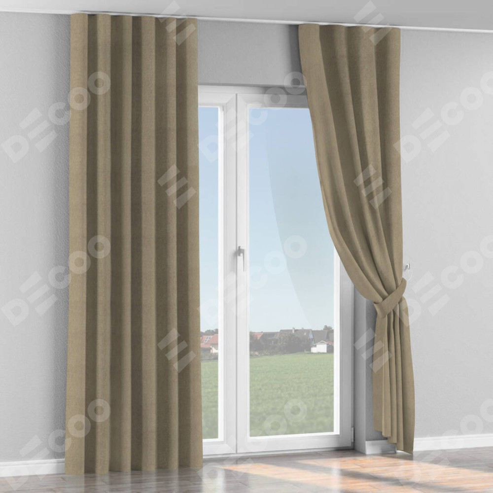 Комплект прямых штор, от производителя «Cortin», пошиты из ткани твид блэкаут кофе, артикул ткани 21575. С изнаночной стороны в верхней части штор пристрачивается шторная лента с декоративными складками «Волна». Для создания элегантных складок прямые шторы шьются по стандарту с коэффициентом 1:2 (на 100 см. ширины проёма 200 см. ширины ткани).