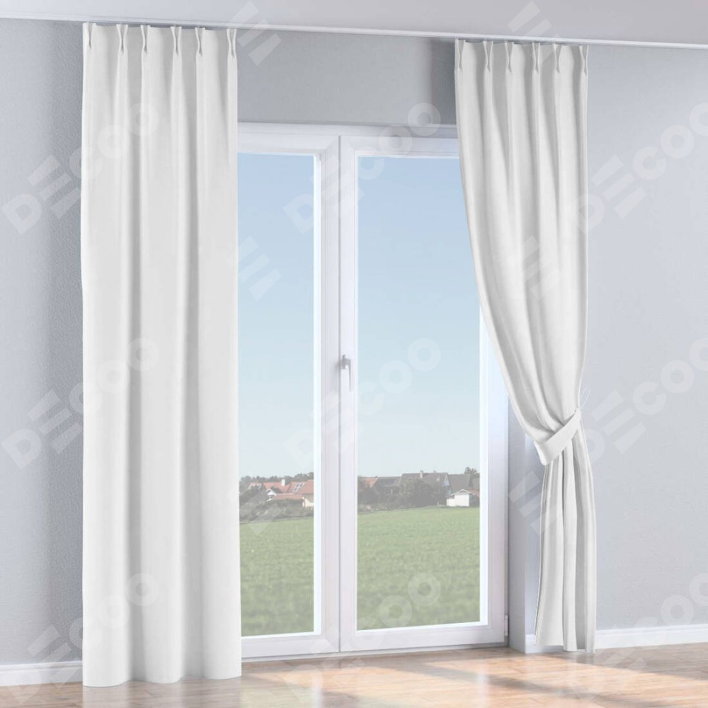 Комплект прямых штор, от производителя «Cortin», пошиты из ткани вельвет дымчато-белый, артикул ткани 85535. С изнаночной стороны в верхней части штор пристрачивается шторная лента с декоративными складками «Кустик». Для создания элегантных складок прямые шторы шьются по стандарту с коэффициентом 1:2 (на 100 см. ширины проёма 200 см. ширины ткани).