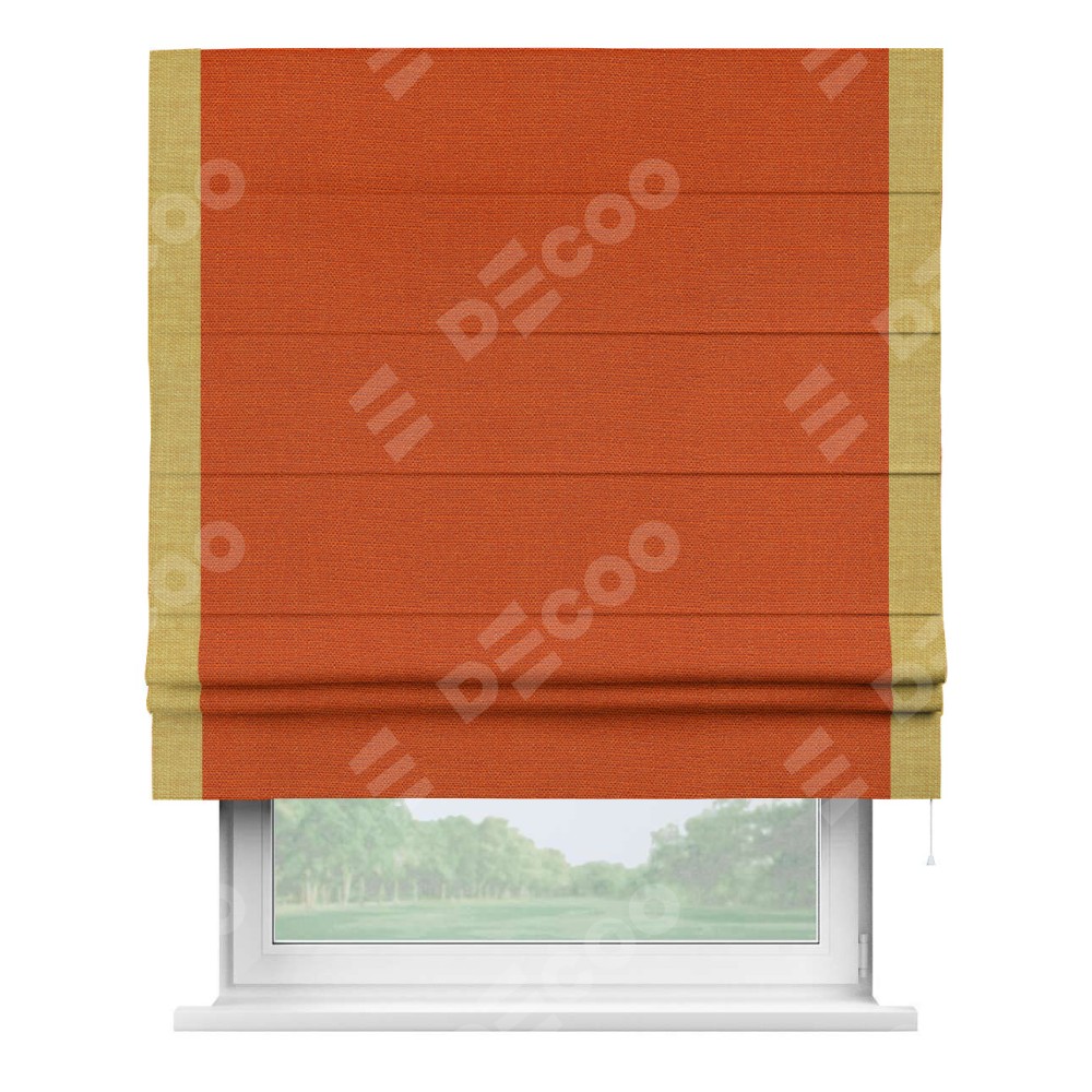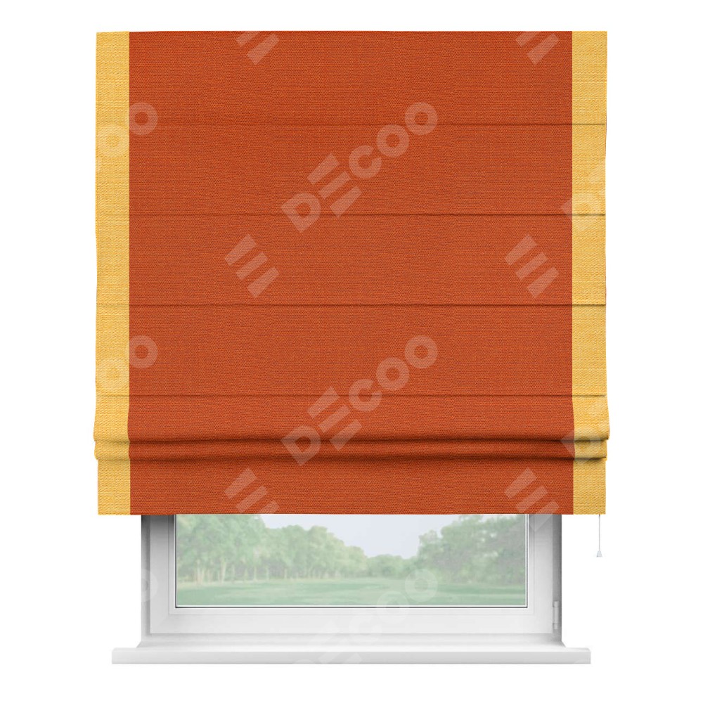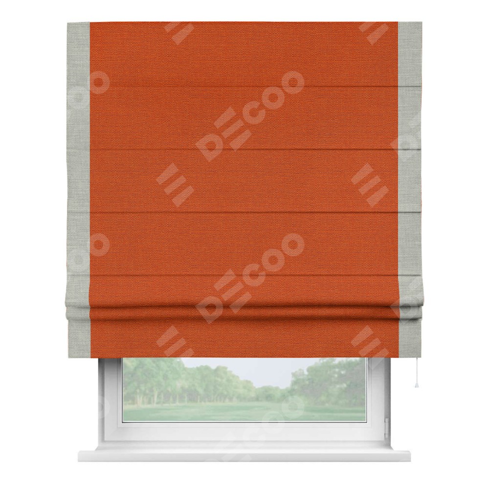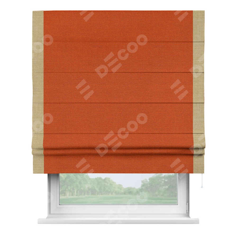 Римская штора производителя «Cortin», используется для проёма, пошита из ткани лён терракотовый, артикул 53440. Отделка шторы кантом «Стрим Дуо», ткань для канта используется из льна разной расцветки на выбор. Имеет универсальный механизм и подходит для монтажа: на потолок, на стену и в нишу.