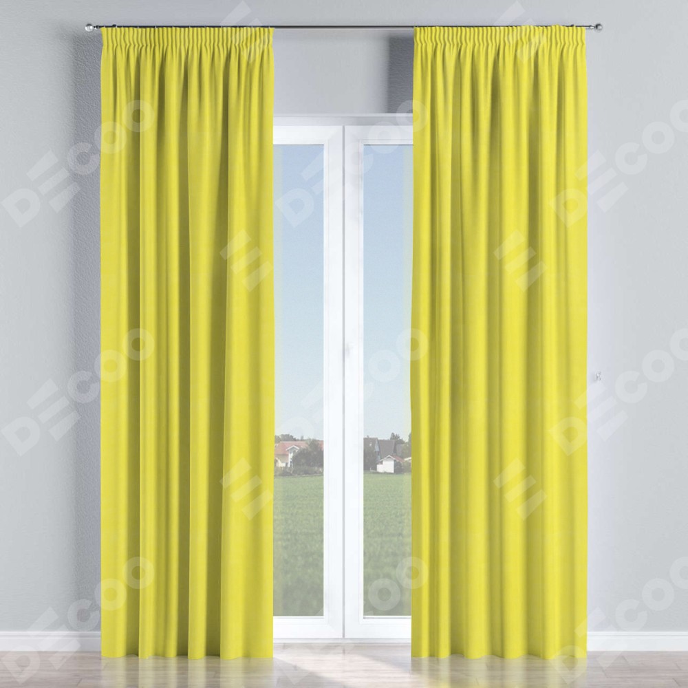 Комплект прямых штор, от производителя «Cortin», пошиты из ткани вельвет светло-желтый, артикул ткани 30997. С изнаночной стороны в верхней части штор пристрачивается шторная лента с декоративными складками «Карандаш». Для создания элегантных складок прямые шторы шьются по стандарту с коэффициентом 1:2 (на 100 см. ширины проёма 200 см. ширины ткани).