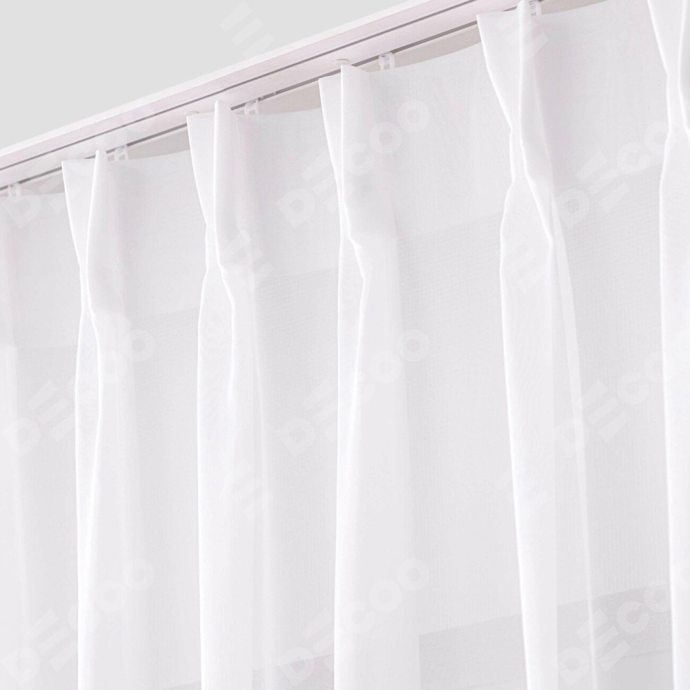 Комплект прямых штор, от производителя «Cortin», пошиты из ткани тюль белый, артикул ткани V-01. С изнаночной стороны в верхней части штор пристрачивается шторная лента с декоративными складками «Кустик». Для создания элегантных складок прямые шторы шьются по стандарту с коэффициентом 1:2 (на 100 см. ширины проёма 200 см. ширины ткани).