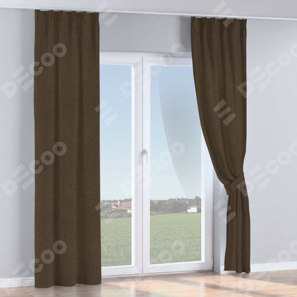 Комплект прямых штор, от производителя «Cortin», пошиты из ткани лён тёмно-коричневый, артикул ткани 53444. С изнаночной стороны в верхней части штор пристрачивается шторная лента с декоративными складками «Кустик». Для создания элегантных складок прямые шторы шьются по стандарту с коэффициентом 1:2 (на 100 см. ширины проёма 200 см. ширины ткани).