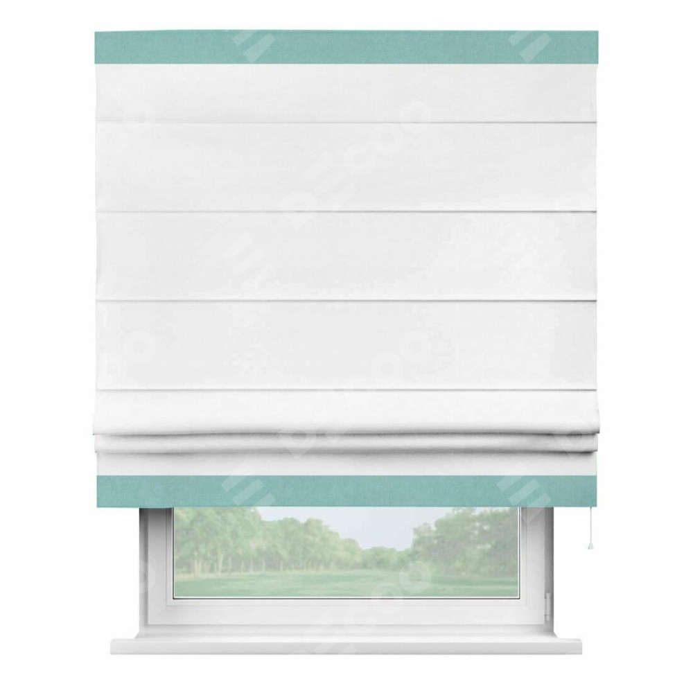 Римская штора производителя «Cortin», используется для проёма, пошита из ткани вельвет белый, артикул ткани 10810. Отделка шторы кантом «Горизонт», ткань для канта используется из вельвета разной расцветки на выбор. Имеет универсальный механизм и подходит для монтажа: на потолок, на стену и в нишу.
