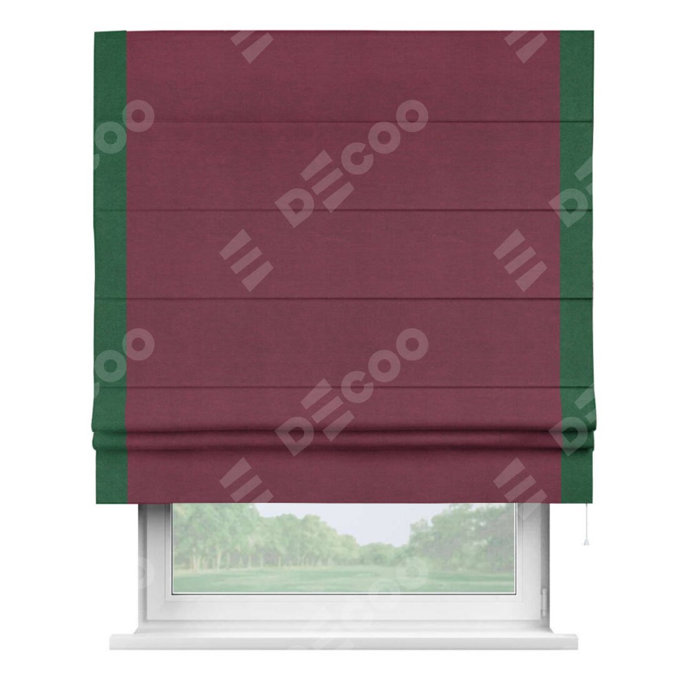 Римская штора производителя «Cortin», используется для проёма, пошита из ткани вельвет бордовый, артикул ткани 85553. Отделка шторы кантом «Стрим Дуо», ткань для канта используется из вельвета разной расцветки на выбор. Имеет универсальный механизм и подходит для монтажа: на потолок, на стену и в нишу.