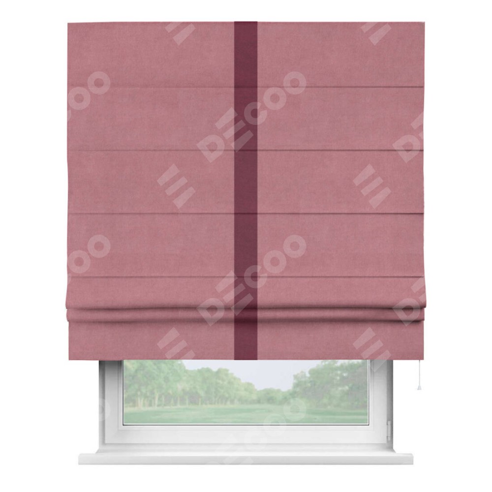 Римская штора производителя «Cortin», используется для проёма, пошита из ткани вельвет брусника, артикул ткани 85550. Отделка шторы кантом «Хайвей», ткань для канта используется из вельвета разной расцветки на выбор. Имеет универсальный механизм и подходит для монтажа: на потолок, на стену и в нишу.
