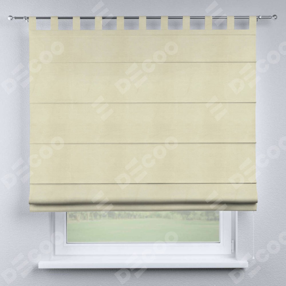 Римская штора производителя «Cortin», используется для проёма, пошита из ткани бархат молочный, артикул ткани 21409. Данная модель пошита на петлях, комплектуется на выбор круглым карнизом и подходит для монтажа на стену. Римская штора на петлях имеет простую систему регулировки высоты, отличительным преимуществом данной модели является простой способ монтажа. Достаточно повесить ее на трубу и штора готова!