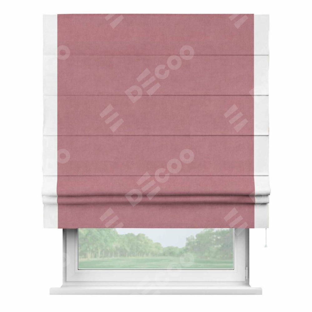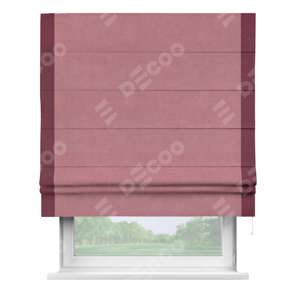 Римская штора производителя «Cortin», используется для проёма, пошита из ткани вельвет брусника, артикул ткани 85550. Отделка шторы кантом «Стрим Дуо», ткань для канта используется из вельвета разной расцветки на выбор. Имеет универсальный механизм и подходит для монтажа: на потолок, на стену и в нишу.