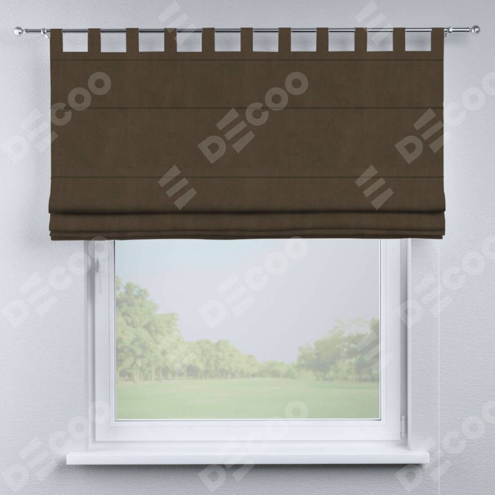 Римская штора производителя «Cortin», используется для проёма, пошита из ткани бархат тёмно-коричневый, артикул ткани 5017. Данная модель пошита на петлях, комплектуется на выбор круглым карнизом и подходит для монтажа на стену. Римская штора на петлях имеет простую систему регулировки высоты, отличительным преимуществом данной модели является простой способ монтажа. Достаточно повесить ее на трубу и штора готова!