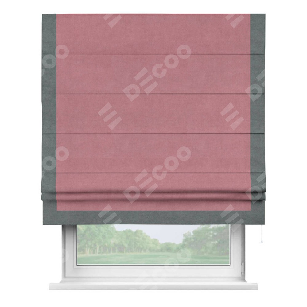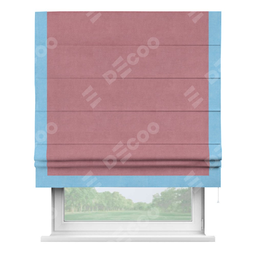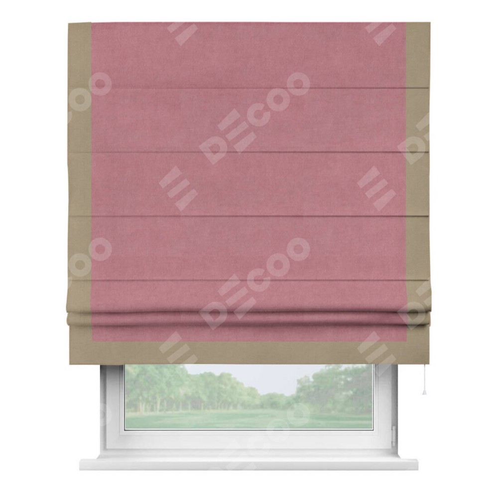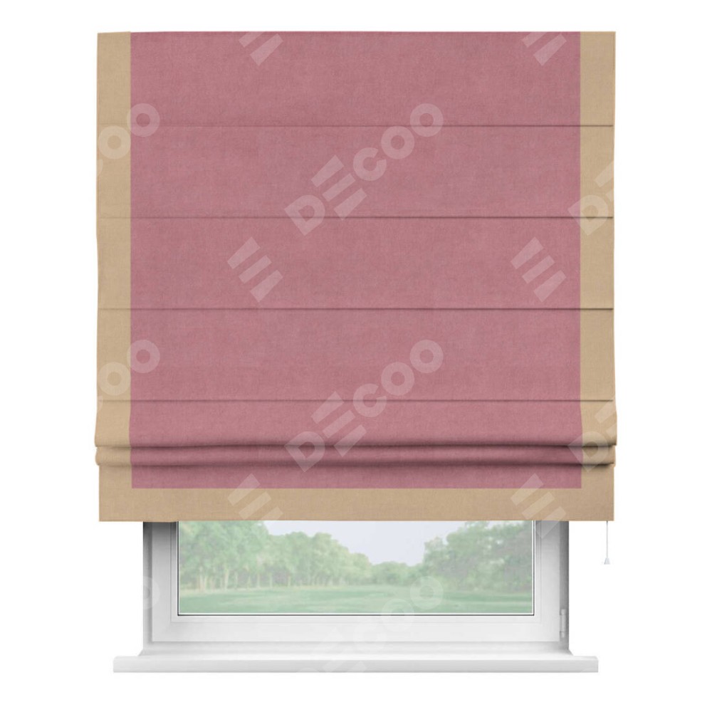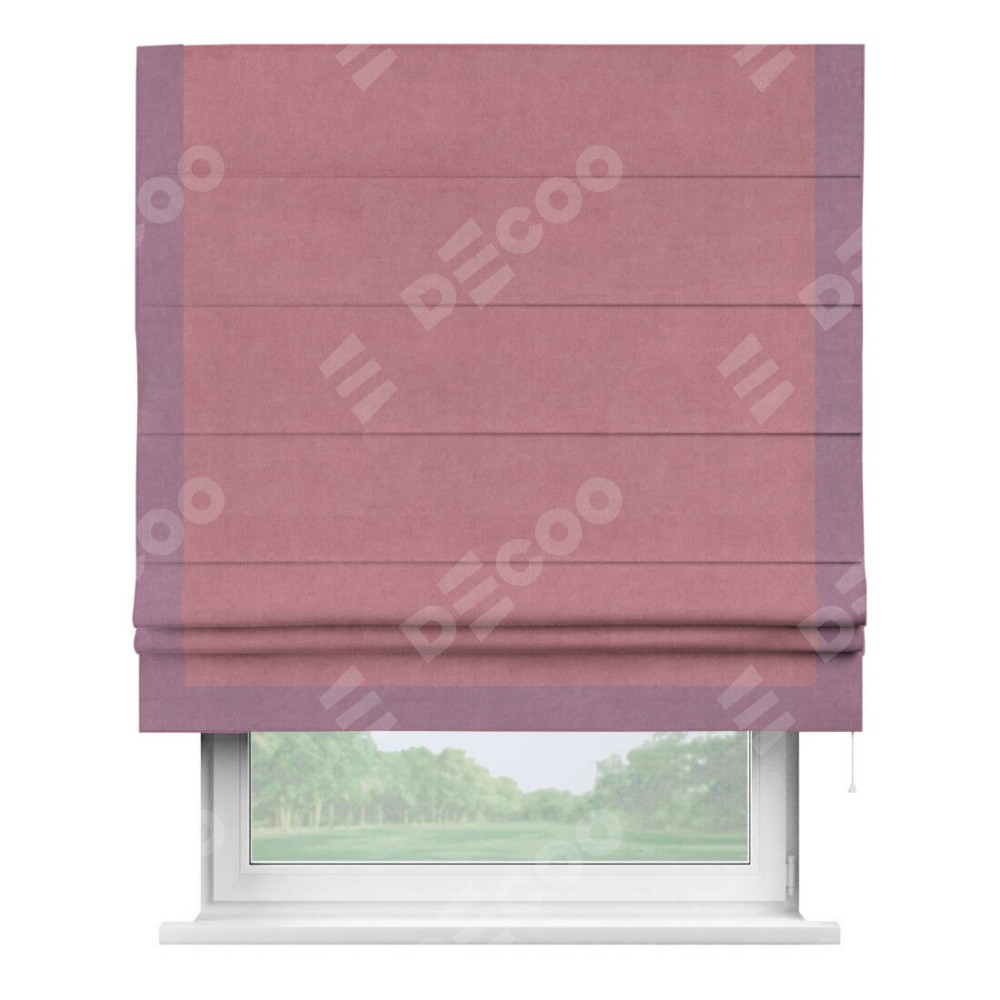 Римская штора производителя «Cortin», используется для проёма, пошита из ткани вельвет брусника, артикул ткани 85550. Отделка шторы кантом «Виктория», ткань для канта используется из вельвета разной расцветки на выбор. Имеет универсальный механизм и подходит для монтажа: на потолок, на стену и в нишу.