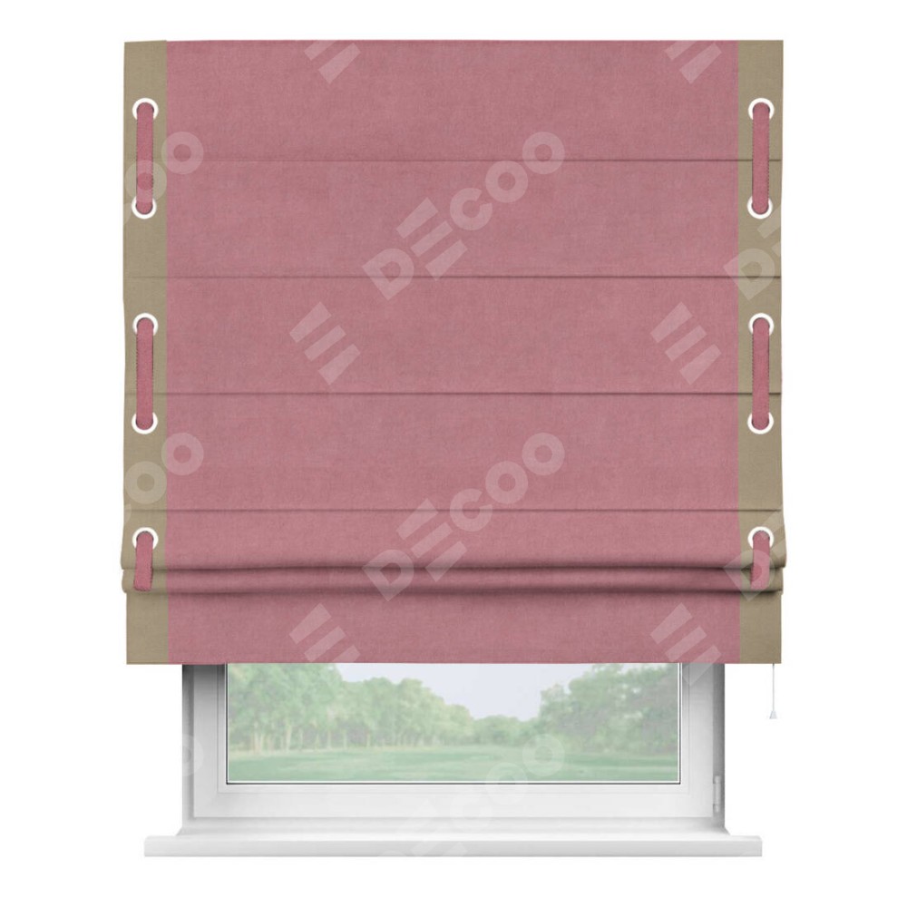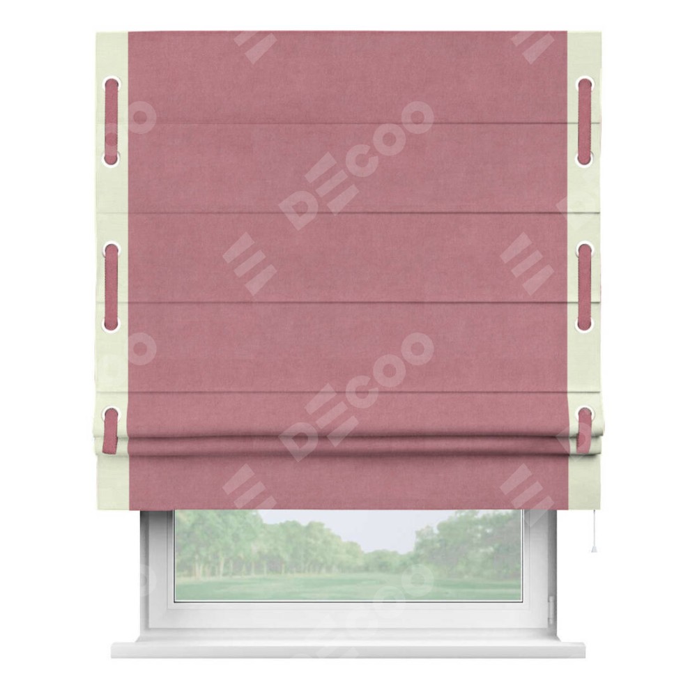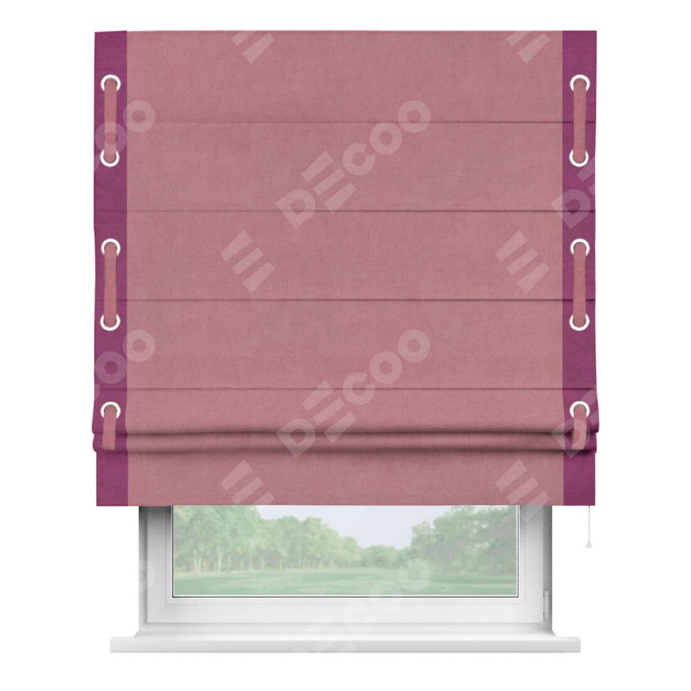 Римская штора производителя «Cortin», используется для проёма, пошита из ткани вельвет брусника, артикул ткани 85550. Отделка шторы кантом «Стрим Дуо» на кантах расположены люверсы с пояском, ткань для канта используется из вельвета разной расцветки на выбор. Ткань для пояска обычно используется из основной ткани шторы, а так же можно сделать из любой расцветки по желанию. Имеет универсальный механизм и подходит для монтажа: на потолок, на стену и в нишу.