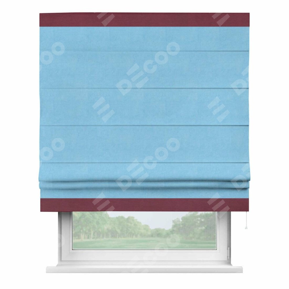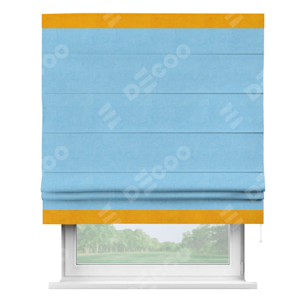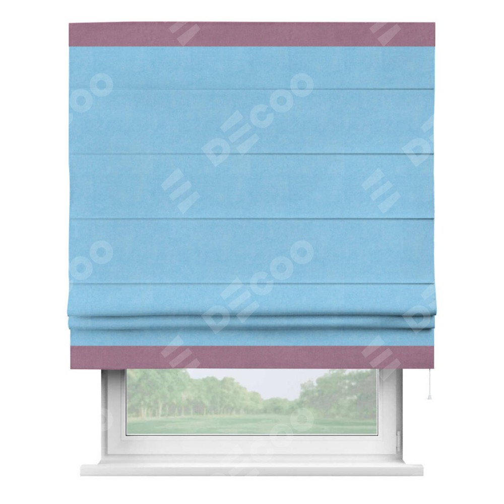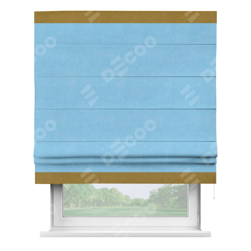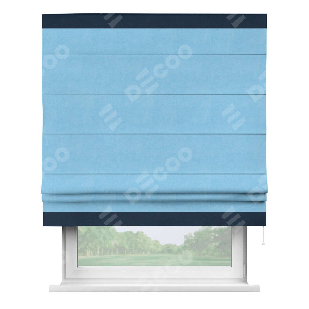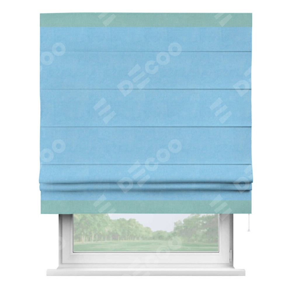 Римская штора производителя «Cortin», используется для проёма, пошита из ткани вельвет голубой, артикул ткани 85544. Отделка шторы кантом «Горизонт», ткань для канта используется из вельвета разной расцветки на выбор. Имеет универсальный механизм и подходит для монтажа: на потолок, на стену и в нишу.