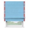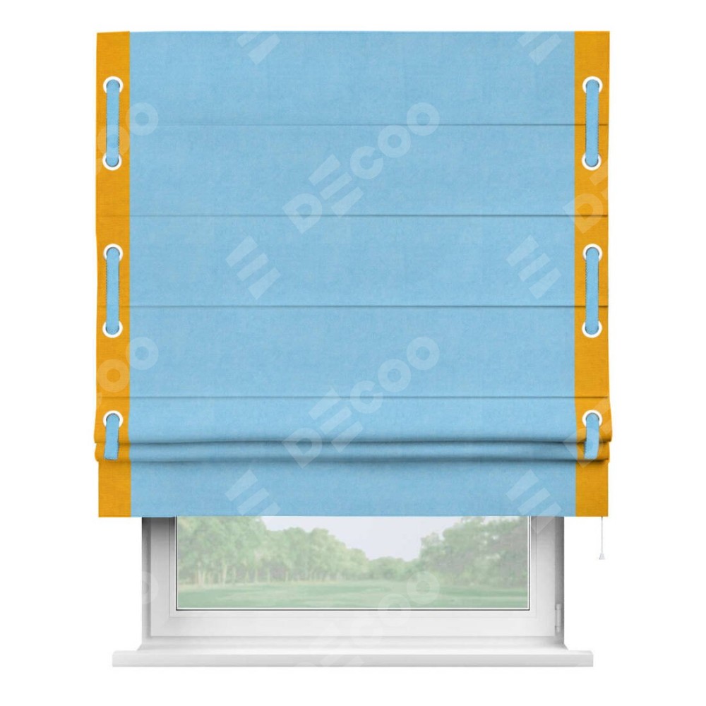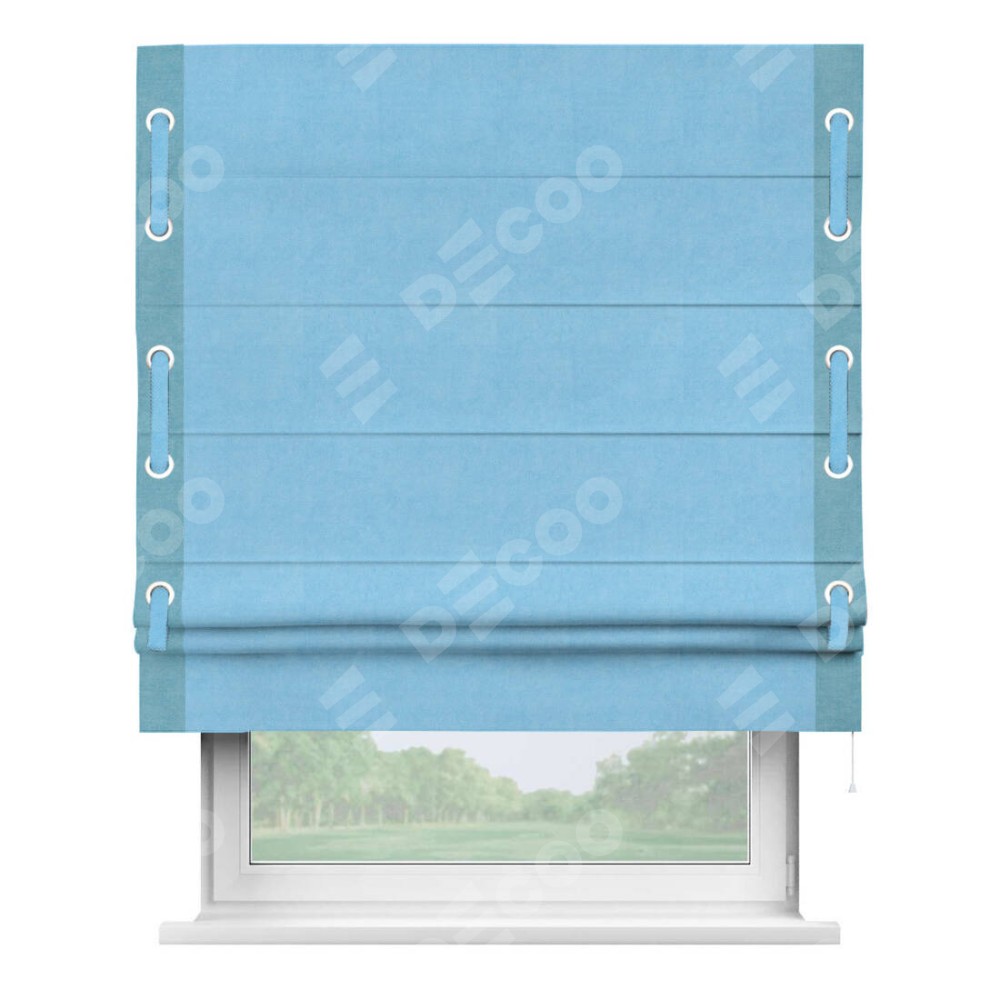 Римская штора производителя «Cortin», используется для проёма, пошита из ткани вельвет голубой, артикул ткани 85544. Отделка шторы кантом «Стрим Дуо» на кантах расположены люверсы с пояском, ткань для канта используется из вельвета разной расцветки на выбор. Ткань для пояска обычно используется из основной ткани шторы, а так же можно сделать из любой расцветки по желанию. Имеет универсальный механизм и подходит для монтажа: на потолок, на стену и в нишу.