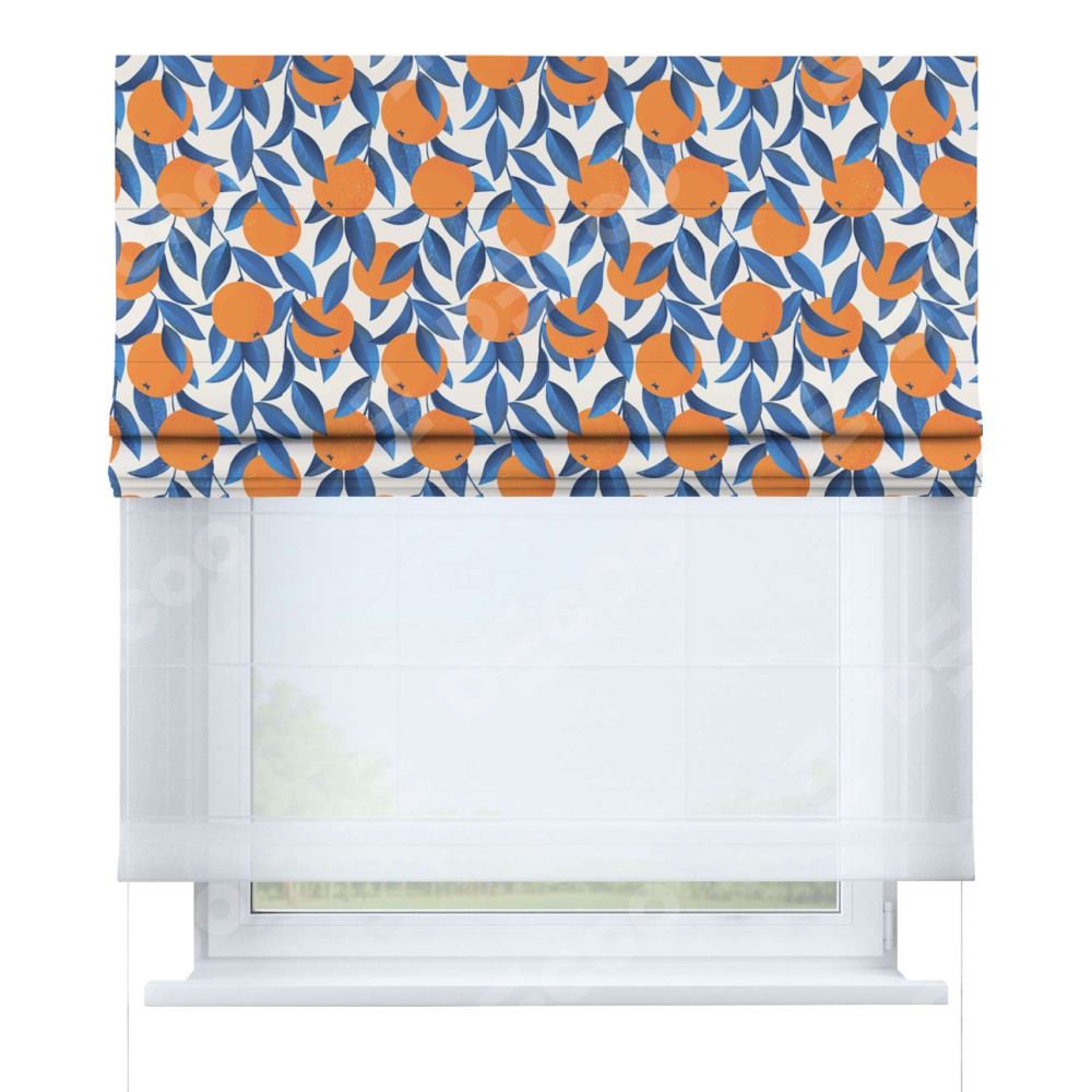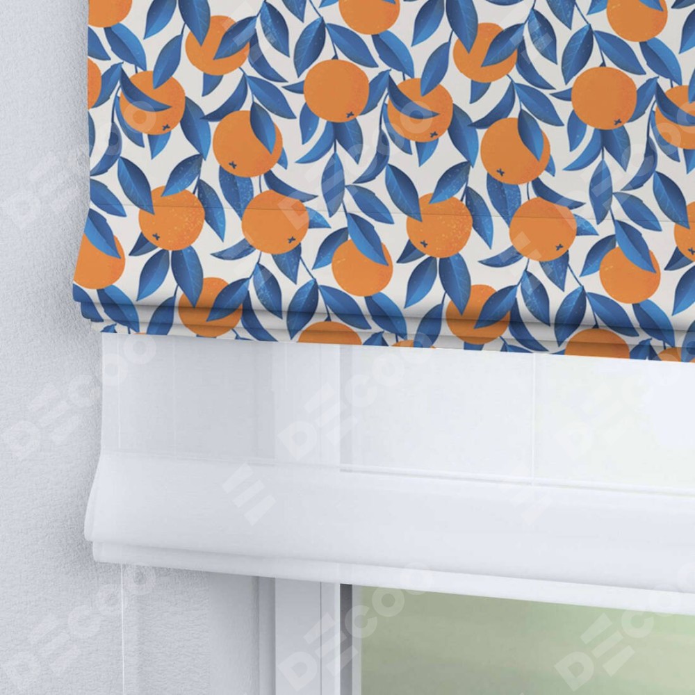 Римская штора день-ночь производителя «Cortin», используется для проёма, пошита из двух полотен, с лицевой блэкаут с нанесением сублимационной печати «Апельсиновое настроение», вторая ткань тюль (по стандарту комплектуется тюль белого цвета артикул V-01). Имеет универсальный механизм и подходит для монтажа: на потолок, на стену и в нишу.