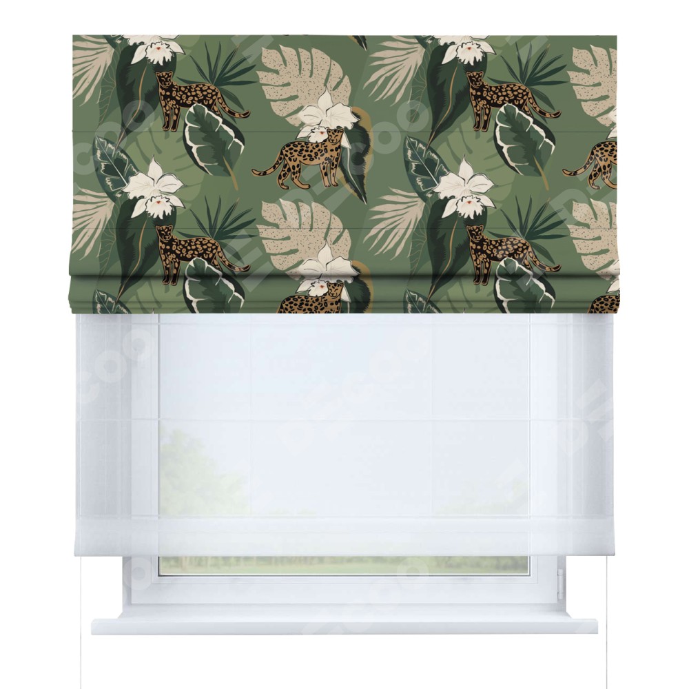Римская штора день-ночь производителя «Cortin», используется для проёма, пошита из двух полотен, с лицевой блэкаут с нанесением сублимационной печати «В тропическом лесу», вторая ткань тюль (по стандарту комплектуется тюль белого цвета артикул V-01). Имеет универсальный механизм и подходит для монтажа: на потолок, на стену и в нишу.