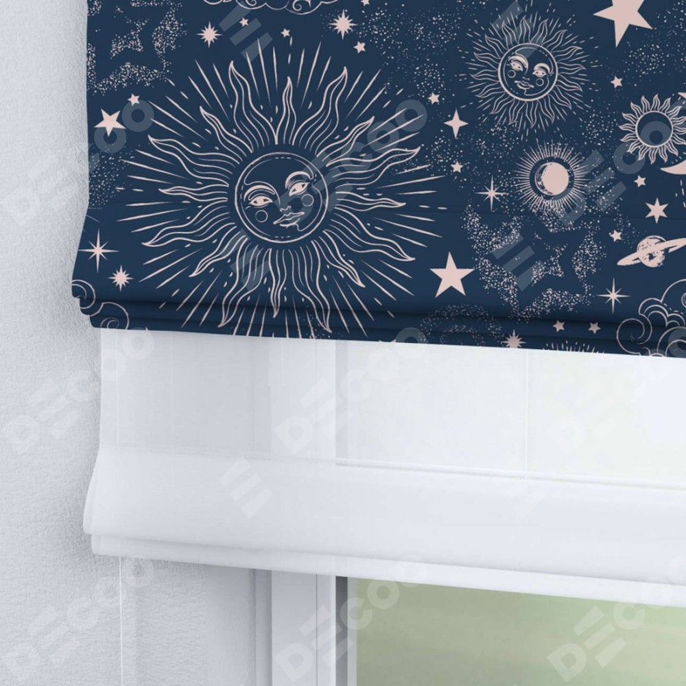 Римская штора день-ночь производителя «Cortin», используется для проёма, пошита из двух полотен, с лицевой блэкаут с нанесением сублимационной печати «Звёзды и планеты», вторая ткань тюль (по стандарту комплектуется тюль белого цвета артикул V-01). Имеет универсальный механизм и подходит для монтажа: на потолок, на стену и в нишу.