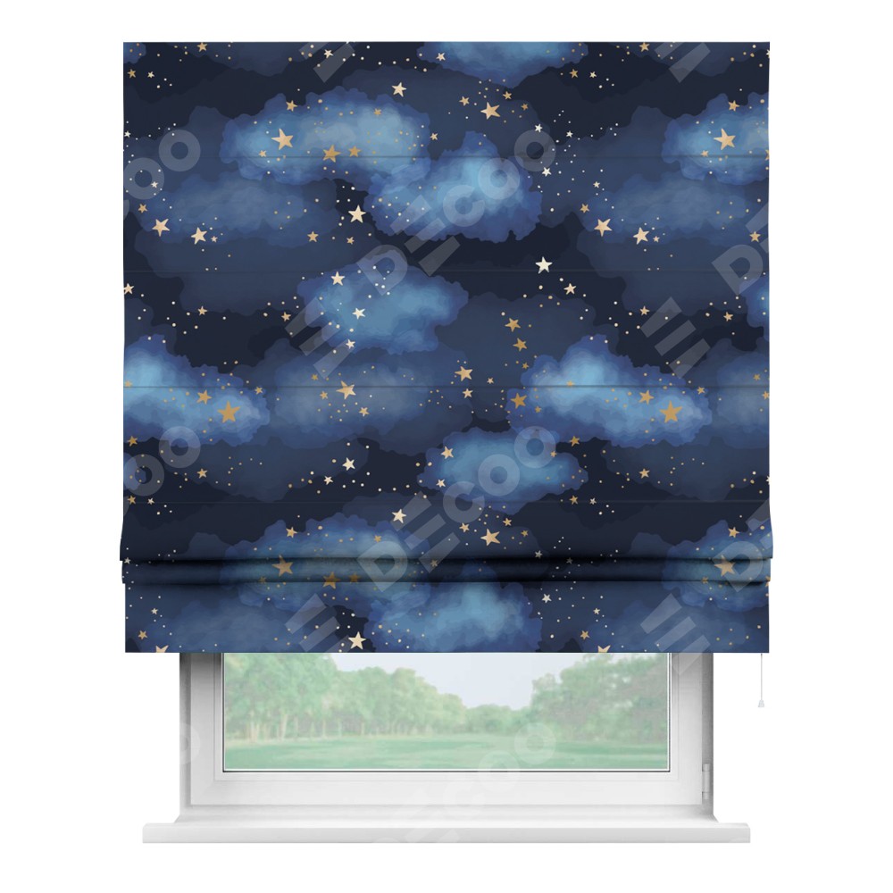 Римская штора производителя «Cortin», используется для проёма, пошита из ткани блэкаут с нанесением сублимационной печати «Золотые звёзды». Имеет универсальный механизм и подходит для монтажа: на потолок, на стену и в нишу.