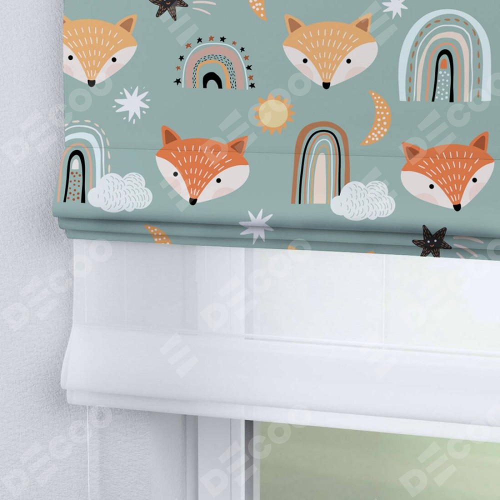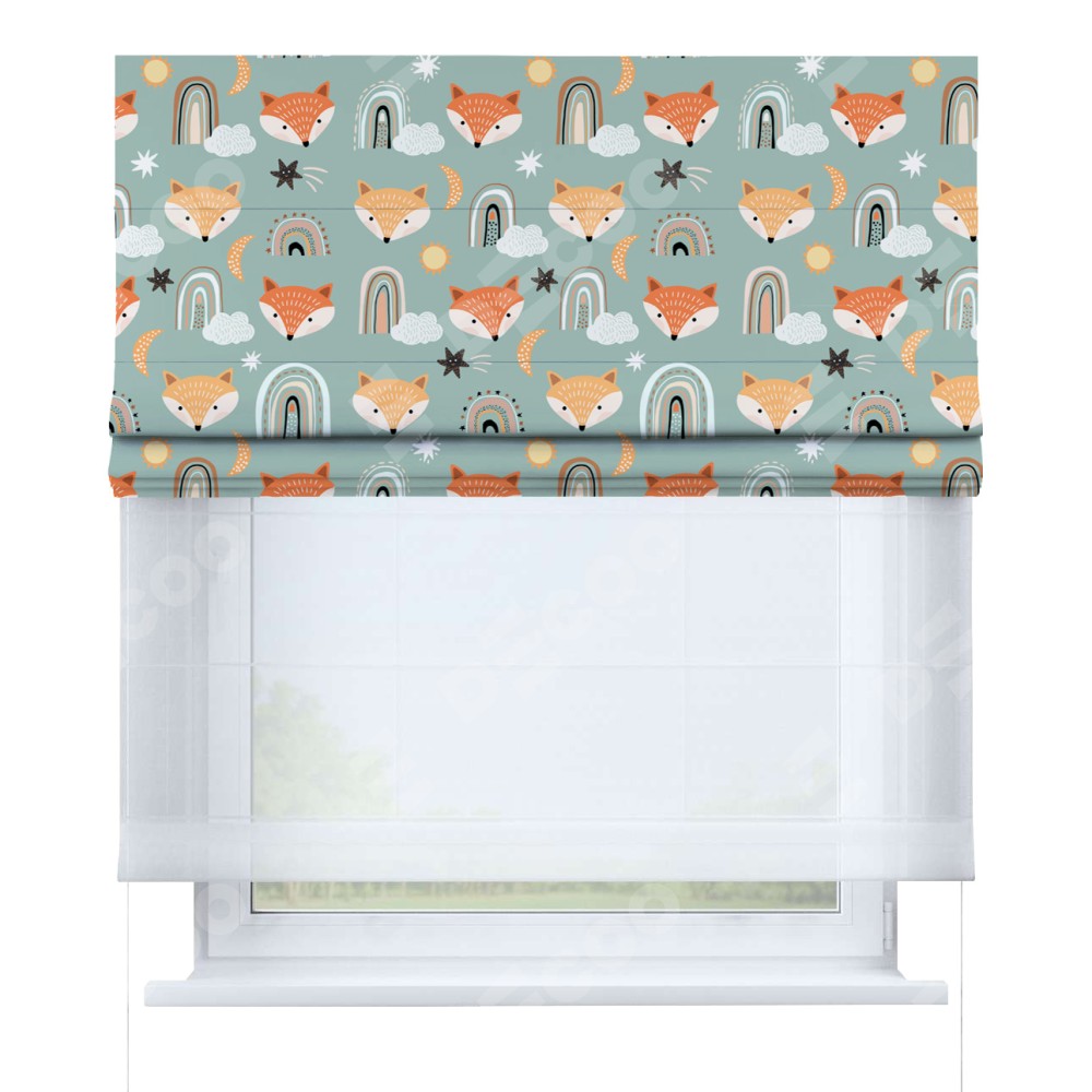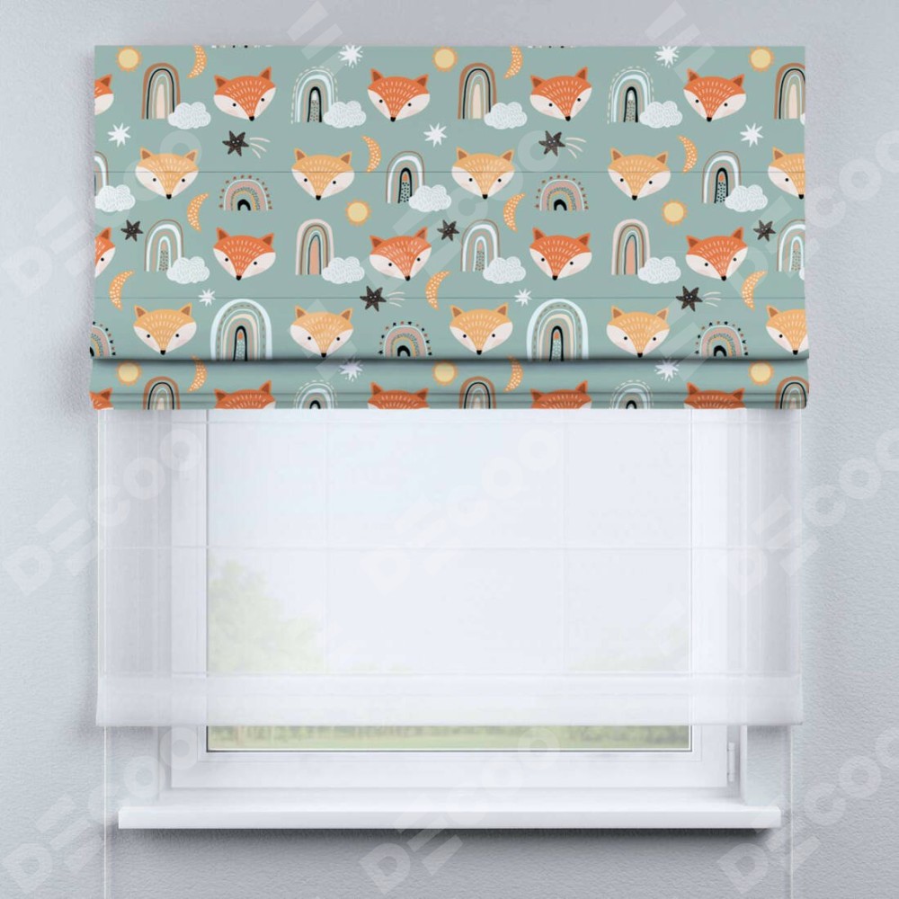 Римская штора день-ночь производителя «Cortin», используется для проёма, пошита из двух полотен, с лицевой блэкаут с нанесением сублимационной печати «Озорные лисички», вторая ткань тюль (по стандарту комплектуется тюль белого цвета артикул V-01). Имеет универсальный механизм и подходит для монтажа: на потолок, на стену и в нишу.