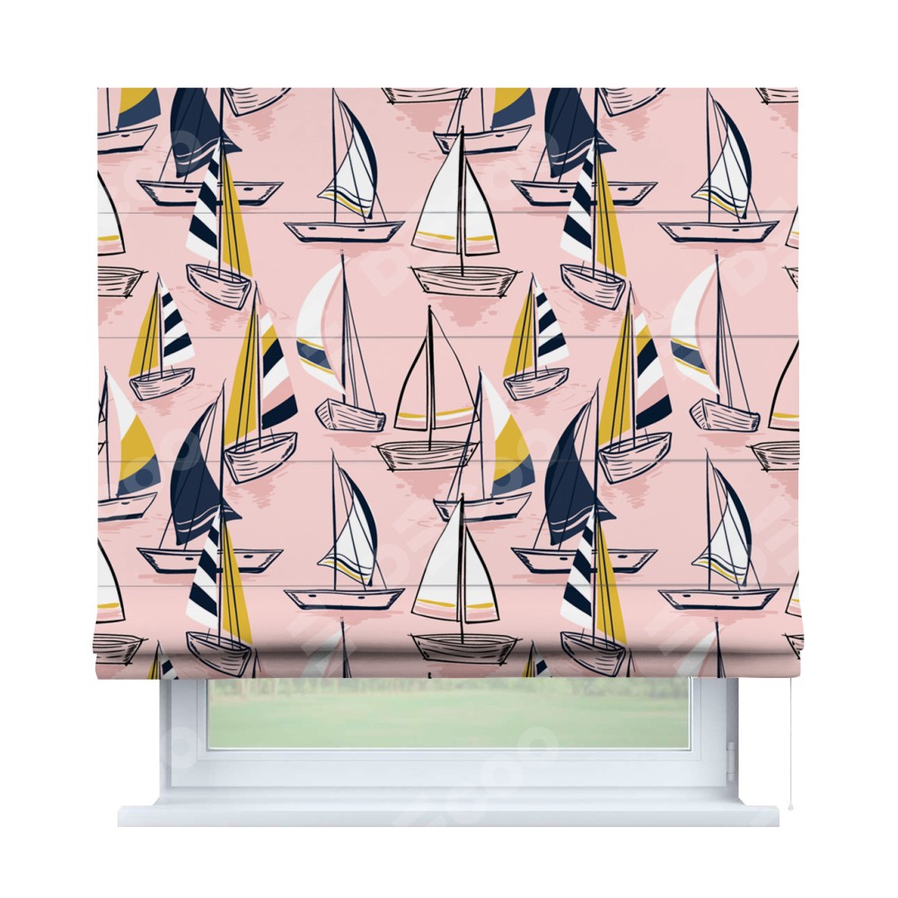 Римская штора производителя «Cortin», используется для проёма, пошита из ткани блэкаут с нанесением сублимационной печати «Парусная регата». Имеет универсальный механизм и подходит для монтажа: на потолок, на стену и в нишу.