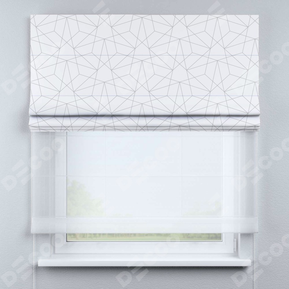 Римская штора день-ночь производителя «Cortin», используется для проёма, пошита из двух полотен, с лицевой блэкаут с нанесением сублимационной печати «Простая геометрия», вторая ткань тюль (по стандарту комплектуется тюль белого цвета артикул V-01). Имеет универсальный механизм и подходит для монтажа: на потолок, на стену и в нишу.