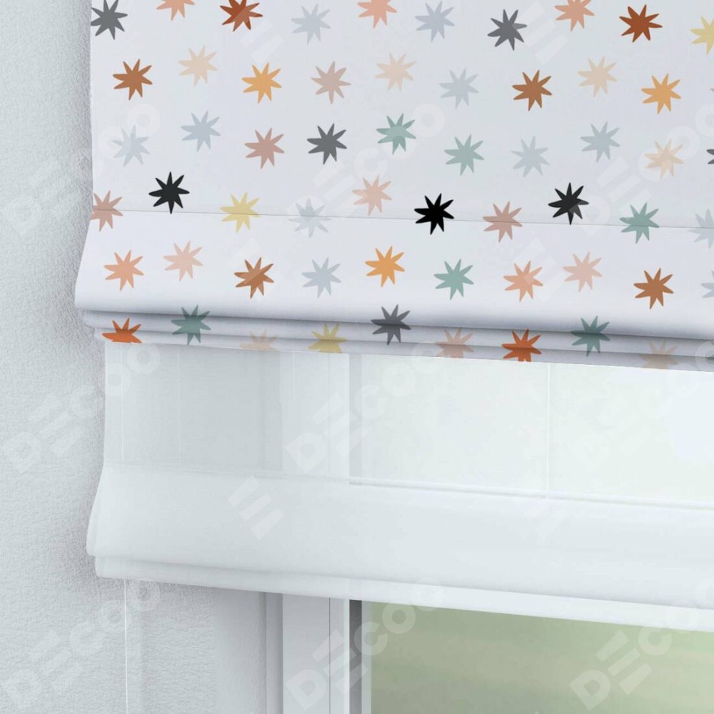 Римская штора день-ночь производителя «Cortin», используется для проёма, пошита из двух полотен, с лицевой блэкаут с нанесением сублимационной печати «Разноцветные звёзды», вторая ткань тюль (по стандарту комплектуется тюль белого цвета артикул V-01). Имеет универсальный механизм и подходит для монтажа: на потолок, на стену и в нишу.