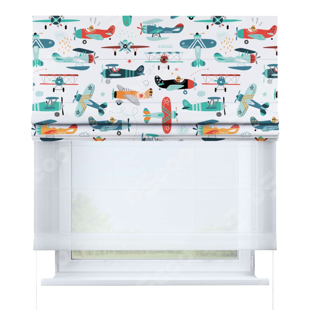Римская штора день-ночь производителя «Cortin», используется для проёма, пошита из двух полотен, с лицевой блэкаут с нанесением сублимационной печати «Самолёты и пилоты», вторая ткань тюль (по стандарту комплектуется тюль белого цвета артикул V-01). Имеет универсальный механизм и подходит для монтажа: на потолок, на стену и в нишу.